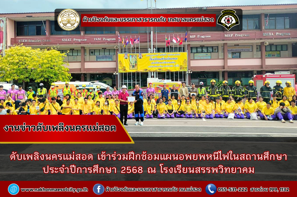 ดับเพลิงนครแม่สอด เข้าร่วมฝึกซ้อมแผนอพยพหนีไฟในสถานศึกษา ประจำปีการศึกษา 2568 ณ โรงเรียนสรรพวิทยาคม