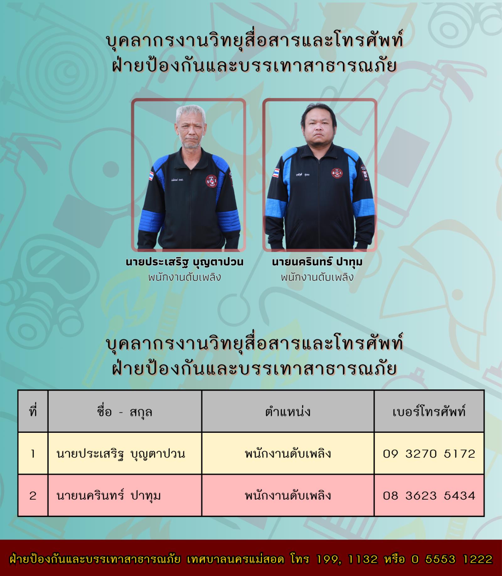 พนักงานประจำห้องวิทยุสื่อสารและโทรศัพท์ - มีหน้าที่รับผิดชอบ ดังนี้ 1. ให้อยู่เวรปฏิบัติหน้าที่วันละ 10 ชั่วโมง/นาย หยุดพักเวร 2 นาย เพื่อคอยรับแจ้งเหตุตลอด 24 ชั่วโมง 2. ประสานงานข้อสั่งการของผู้บังคับบัญชา ด้านสาธารณภัย หรือด้านอื่น ที่ได้รับมอบหมาย 3. ประสานงานกับหน่วยงานอื่น เมื่อเกิดสาธารณภัย หรือด้านอื่น ที่ได้รับมอบหมาย 4. จดบันทึกข้อมูลการออกปฏิบัติงานสาธารณภัยทุกครั้ง ให้ละเอียดครบถ้วน และชัดเจน 5. ประสานงานวิทยุสื่อสารและโทรศัพท์ ด้วยความสุภาพ ถูกต้อง รวดเร็ว ให้บังเกิดผลดีต่อทางราชการ 6. ปฏิบัติหน้าที่อื่น ตามที่ผู้บังคับบัญชามอบหมาย