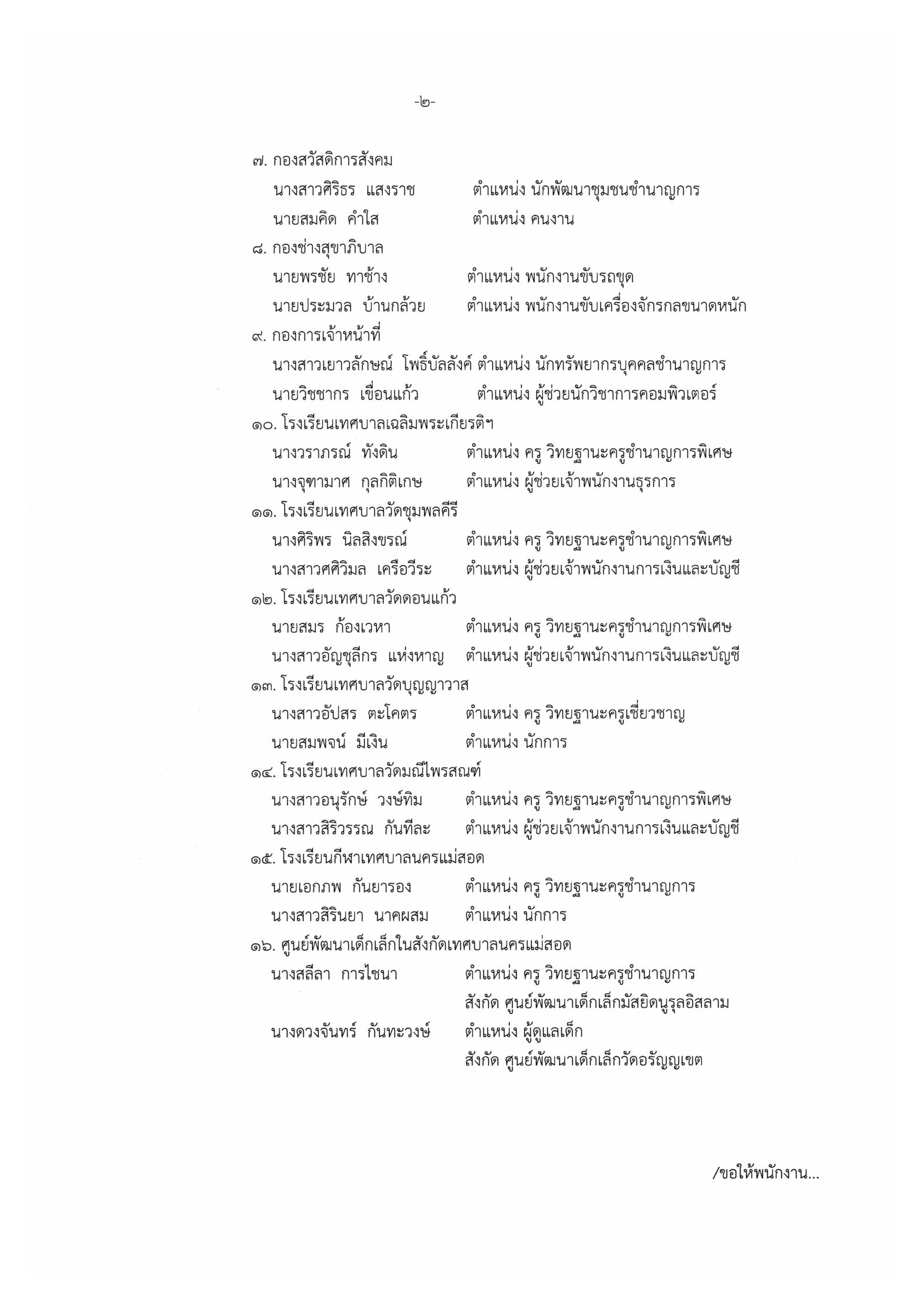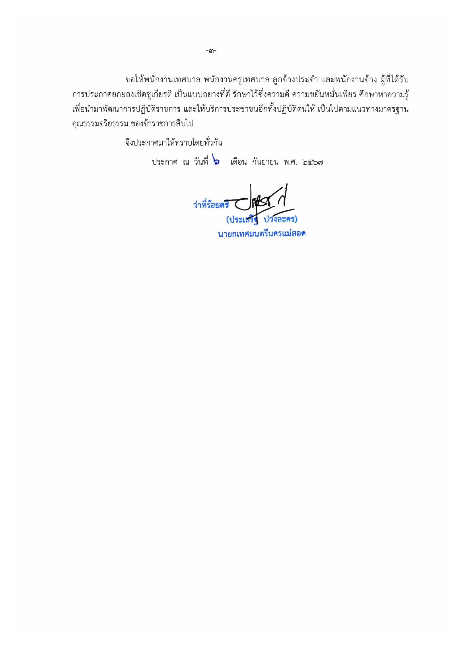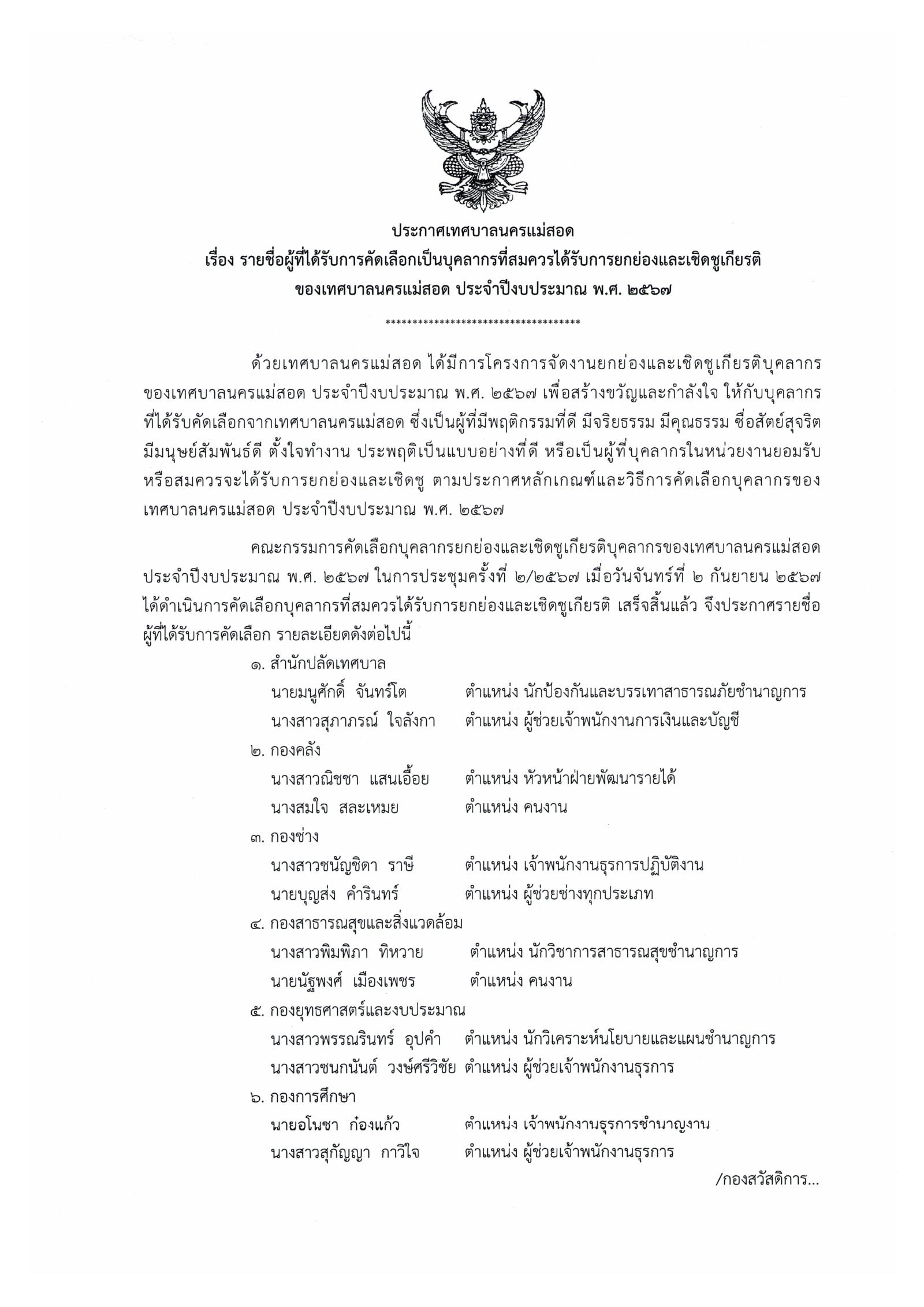 ประกาศเทศบาลนครแม่สอด เรื่อง รายชื่อผู้ที่ได้รับการคัดเลือกเป็นบุคลากรที่สมควรได้รับการยกย่องและเชิดชูเกียรติของเทศบาลนครแม่สอด ประจำปีงบประมาณ พ.ศ. 2567