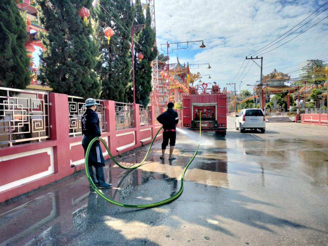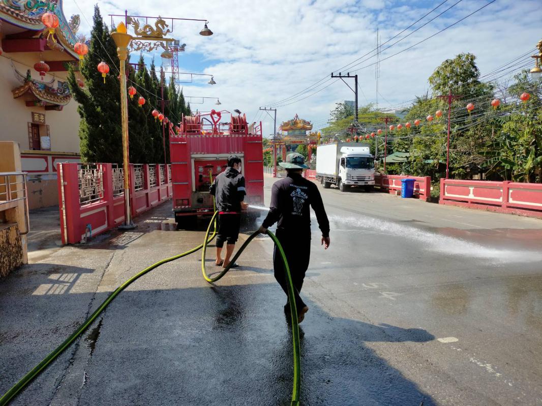 วันที่ 18 กุมภาพันธ์ 2565 เวลา 10.30 น. เจ้าหน้าที่ดับเพลิง ฝ่ายป้องกันและบรรเทาสาธารณภัย นำรถยนต์บรรทุกน้ำดับเพลิง จำนวน 1 คัน ออกฉีดล้างทำความสะอาดบริเวณหน้าศาลาอเนกประสงค์และถนนโดยรอบ หน้าแม่สอดมูลนิธิสามัคคีการกุศล(ศาลเจ้าจีน) เพื่อขจัดสิ่งปนเปื้อน ขจัดเศษหิน ดิน ทราย รวมถึงป้องกันการแพร่ระบาดของเชื้อไวรัสโคโรน่าไวรัส 2019