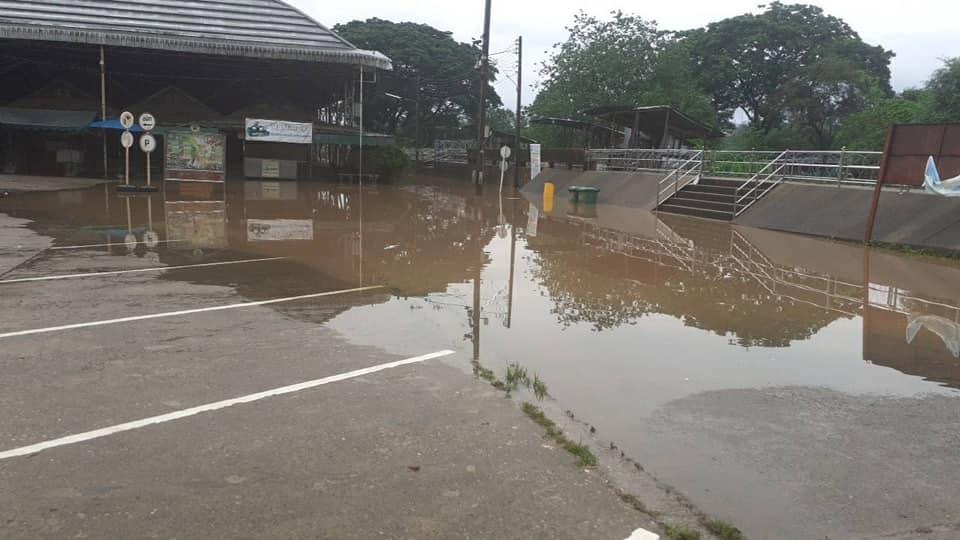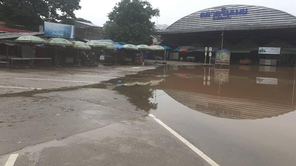 บริเวณลานจอดรถตลาดริมเมยมีน้ำท่วมขัง แต่ยังไม่เข้าซุ้มริมเมยบริเวณชุมชนบ้านริมเมยน้ำข้ามถนนแล้ว