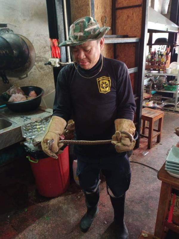 วันที่ 21 กุมภาพันธ์ 2566 เวลา 13.00 น. ฝ่ายป้องกันฯ นครแม่สอด ได้รับแจ้งมีงูเข้าร้านตำยกครก ถนนสายเอเชีย อำเภอแม่สอด จังหวัดตาก จึงรายงานให้ผู้บังคับบัญชาทราบ พร้อมนำรถยนต์ตรวจการณ์และอุปกรณ์ ออกตรวจสอบและปฏิบัติหน้าที่ พบงูยาวประมาณ 1 เมตร หลบซ่อนตัวอยู่บริเวณห้องครัว จึงทำการช่วยเหลือ พร้อมจับปล่อยคืนสู่ธรรมชาติ