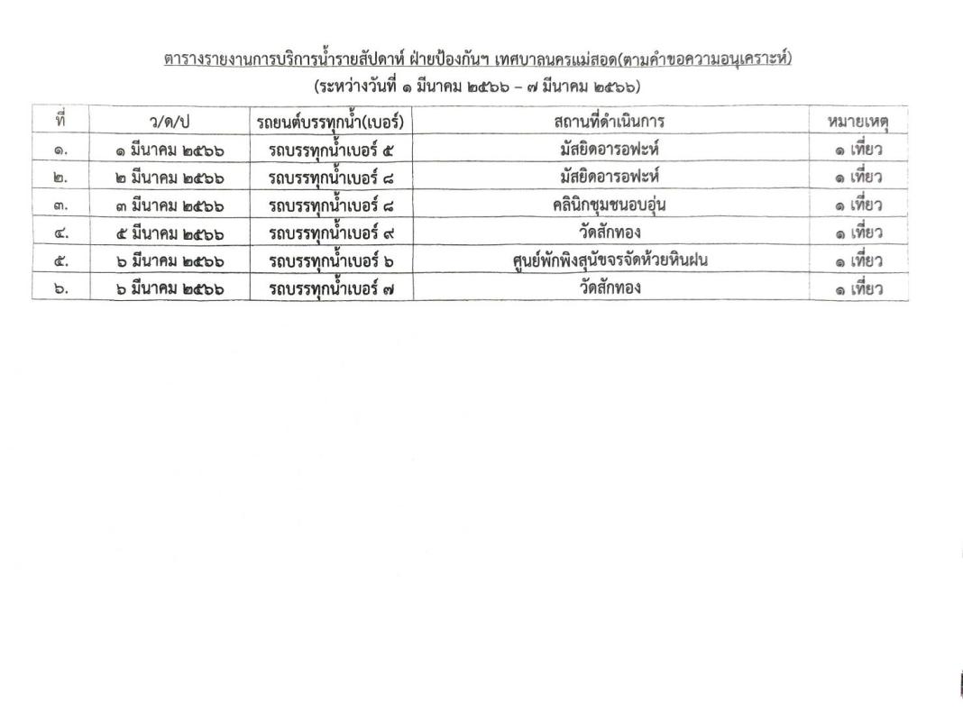 รายงานบริการน้ำ ระหว่างวันที่ 1-7 ประจำเดือนมีนาคม 2566
