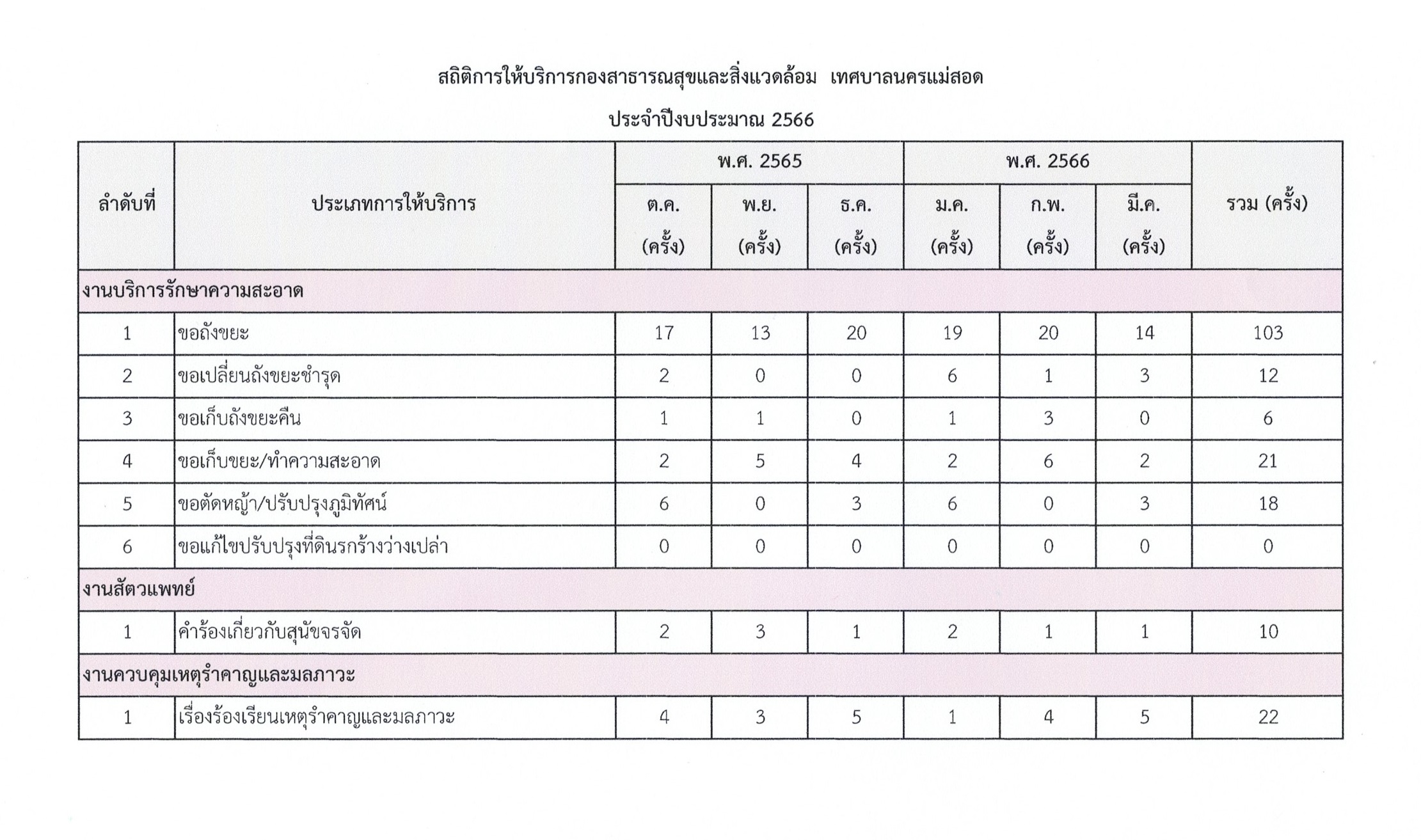 สถิติการให้บริการประชาชน ของกองสาธารณสุขและสิ่งแวดล้อม เทศบาลนครแม่สอด ประจำปีงบประมาณ 2566