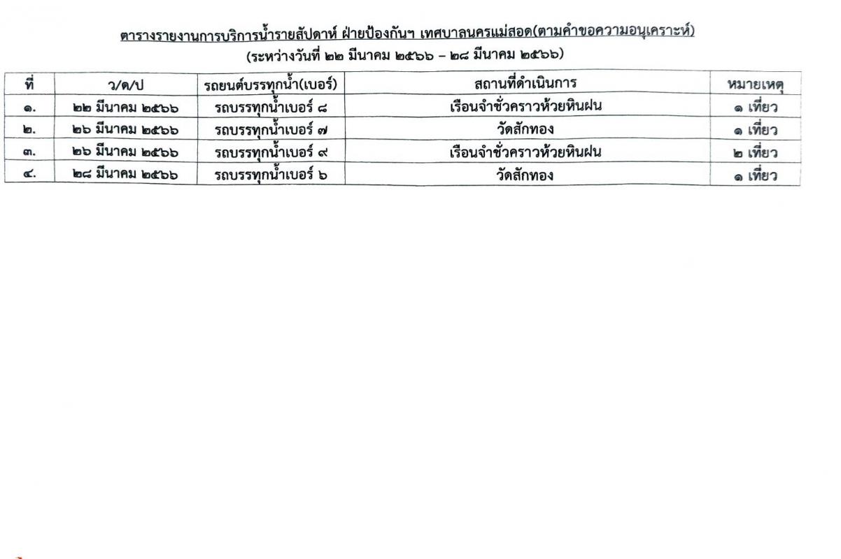 รายงานบริการน้ำ ระหว่างวันที่ 22-28 ประจำเดือนมีนาคม 2566