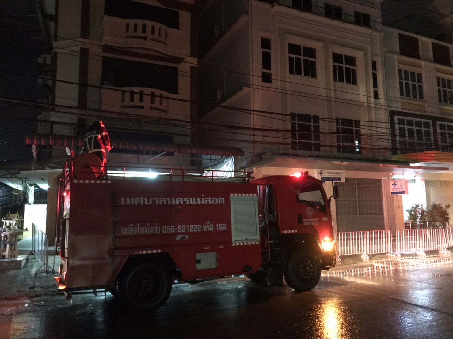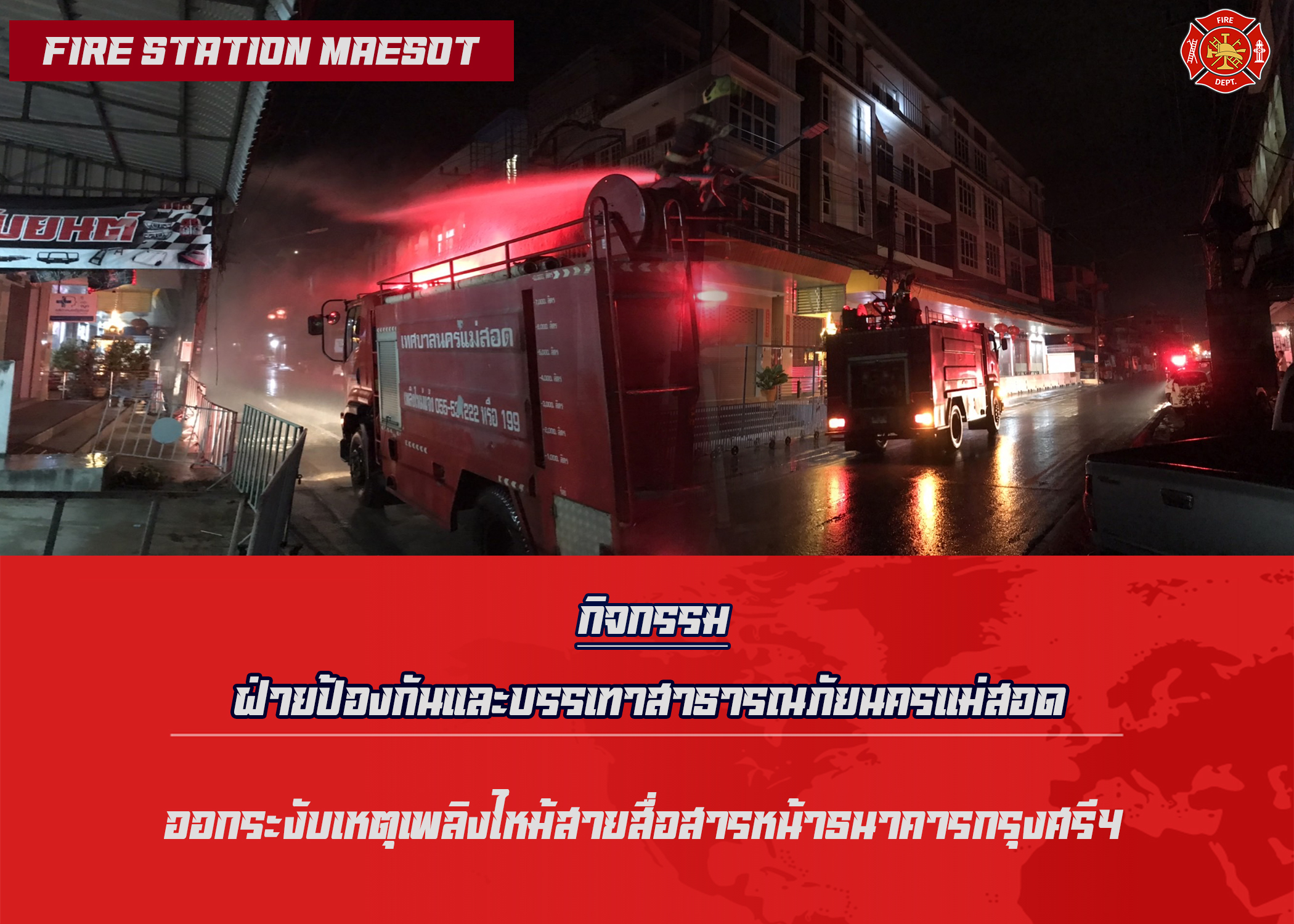 วันที่ 14 มิถุนายน 2566 เวลา 23.00 น. ฝ่ายป้องกันฯ นครแม่สอด ได้รับแจ้งเหตุเพลิงไหม้สายไฟฟ้า บริเวณหน้าธนาคารกรุุงศรีอยุธยา ต.แม่สอด อ.แม่สอด จ.ตาก จึงนำรถยนต์บรรทุกน้ำดับเพลิง ออกปฏิบัติหน้าที่ เมื่อถึงสถานที่เกิดเหตุพบเพลิงกำลังลุกไหม้สายไฟฟ้า(สื่อสาร) บริเวณโดยรอบมีบ้านประชาชน จึงทำการระงับเหตุเพลิงไหม้โดยการฉีดน้ำ จนสามารถควบคุมเพลิงไหม้ไว้ได้ พร้อมประสานการไฟฟ้าฯ แม่สอด และทำการเฝ้าระวังที่เกิดเหตุเพราะอาจจะเกิดเพลิงไหม้ซ้ำซ้อนได้