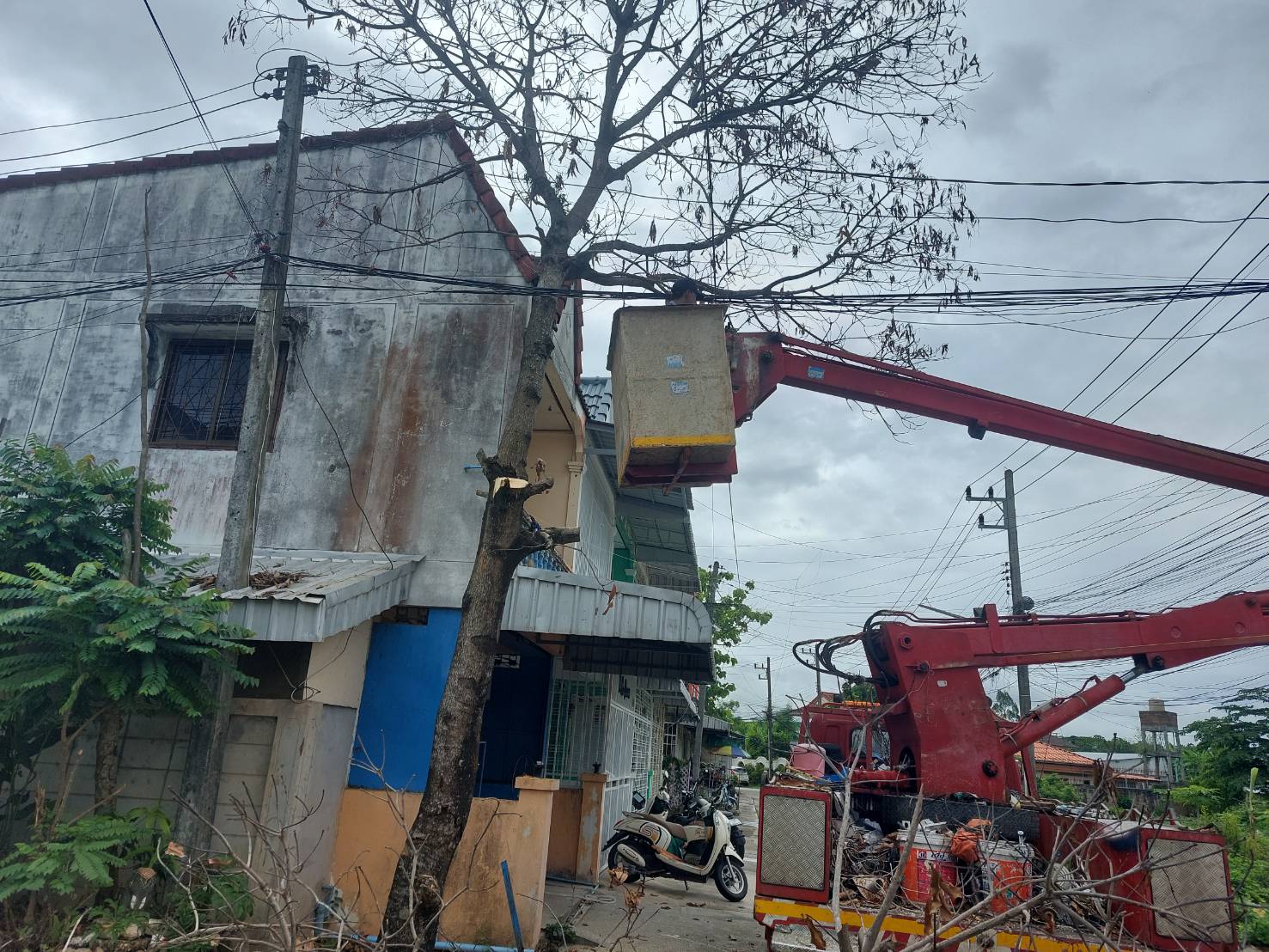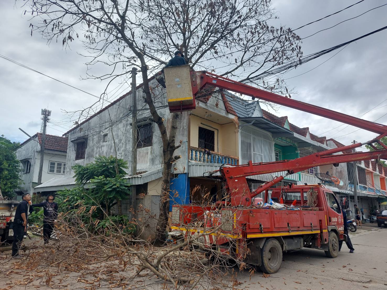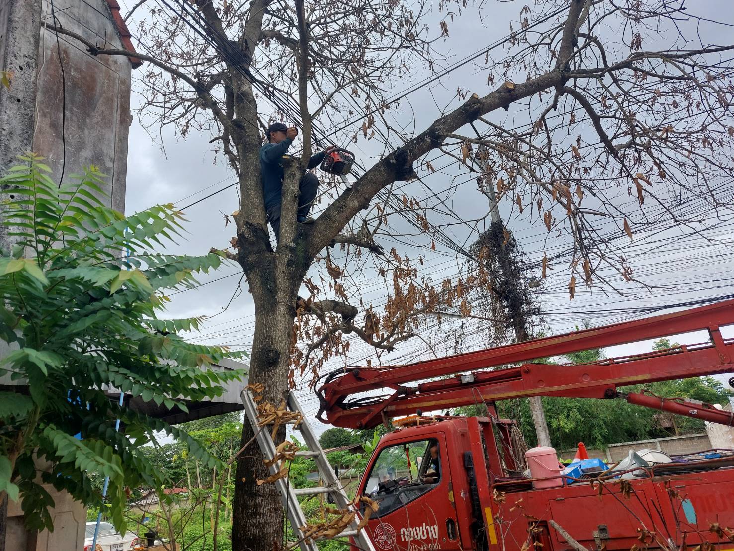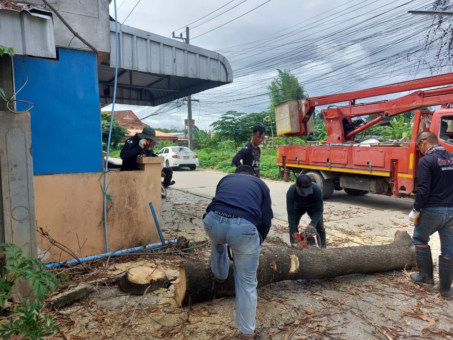 วันที่ 19 มิถุนายน 2566 ฝ่ายป้องกันฯ นครแม่สอด ได้รับคำขอความอนุเคราะห์จากประชาชนให้ช่วยตัดต้นไม้แห้งตาย(ต้นมะม่วง) ถนนสมัครสรรพการ ตำบลแม่สอด อำเภอแม่สอด จังหวัดตาก เกรงว่าเมื่อเกิดฝนตกลมแรงอาจเกิดการล้มทับก่อให้เกิดอันตรายได้ เมื่อได้รับคำขอดังกล่าว จึงนำรถยนต์บรรทุก 6 ล้อ พร้อมอุปกรณ์ ออกตรวจสอบพื้นที่ พบว่ามีต้นไม้แห้งสูงและเสี่ยงต่อการเกิดเหตุอันตรายจริง จึงประสานรถกระเช้าไฟฟ้าเข้าร่วมดำเนินการจุดดังกล่าว พนักงานดับเพลิงทำการใช้มีด เลื่อยโซ่ยนต์ ทำการตัดจนพร้อมยกใส่รถยนต์บรรทุกดำเนินการต่อไป