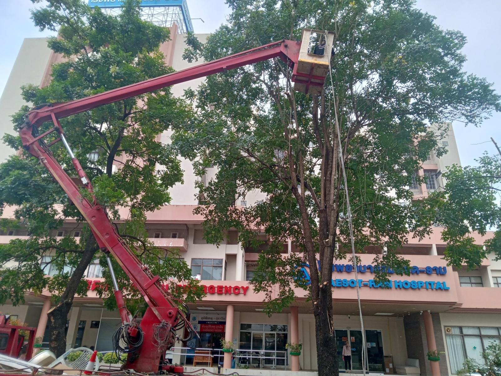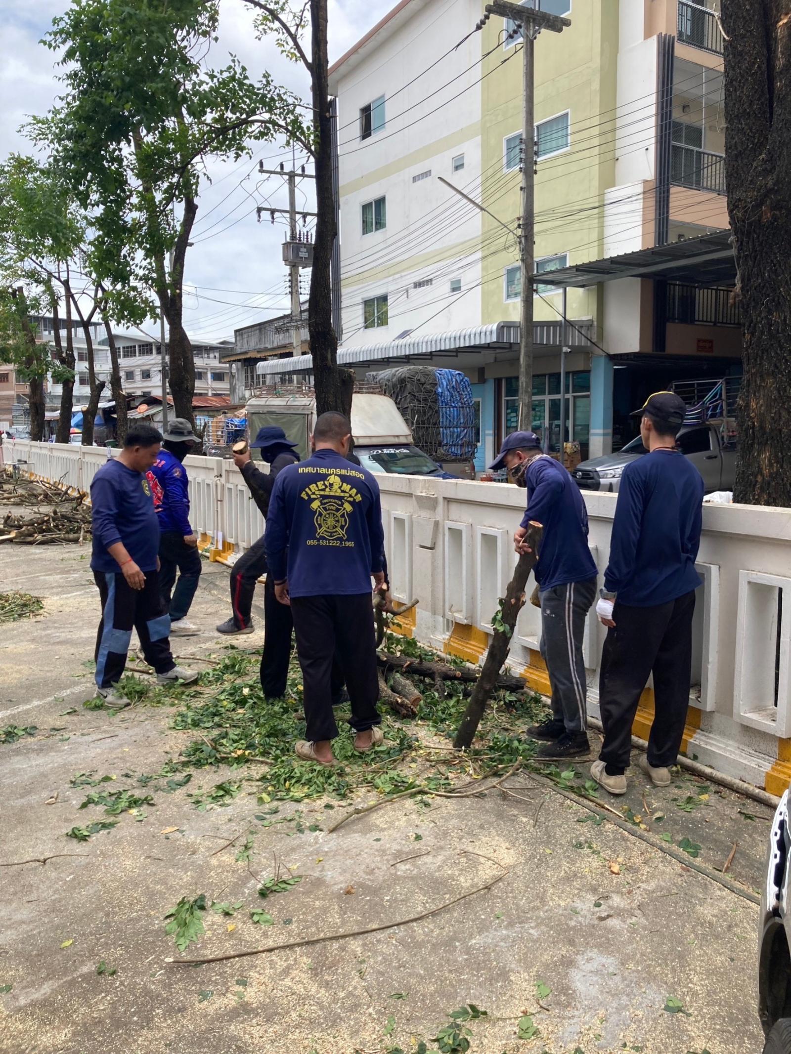 วันที่ 23 สิงหาคม 2566 เวลา 09.00 น.ฝ่ายป้องกันฯ นครแม่สอด ได้รับคำร้องขอความอนุเคราะห์ตัดต้นไม้หน้าโรงพยาบาลแม่สอด-ราม อำเภอแม่สอด จังหวัดตาก เนื่องจากต้นไม้อยู่ใกล้สายไฟฟ้าและรั้ว อาจก่อให้เกิดอันตรายได้ จึงนำรถยนต์บรรทุก 6 ล้อ และอุปกรณ์ พร้อมประสานรถกระเช้าไฟฟ้าเข้าร่วมดำเนินการจุดดังกล่าว โดยทำการใช้มีด เลื่อยโซ่ยนต์ ทำการตัดจนแล้วเสร็จ พร้อมยกใส่รถยนต์บรรทุกดำเนินการต่อไป เพื่อความเป็นระเบียบเรียบร้อย ความปลอดภัยแก่บ้านเรือนประชาชนที่อาศัยอยู่บริเวณดังกล่าว
