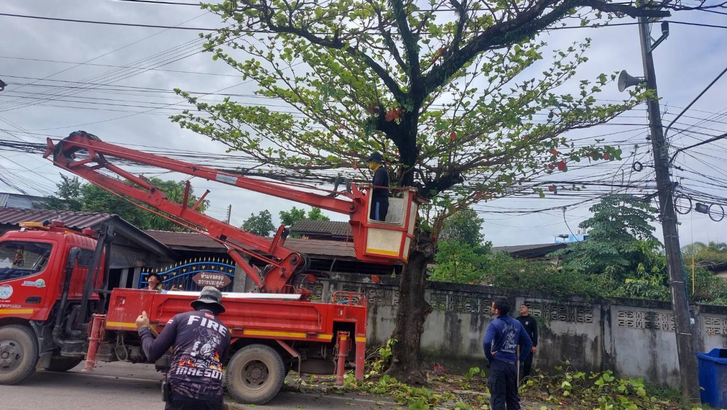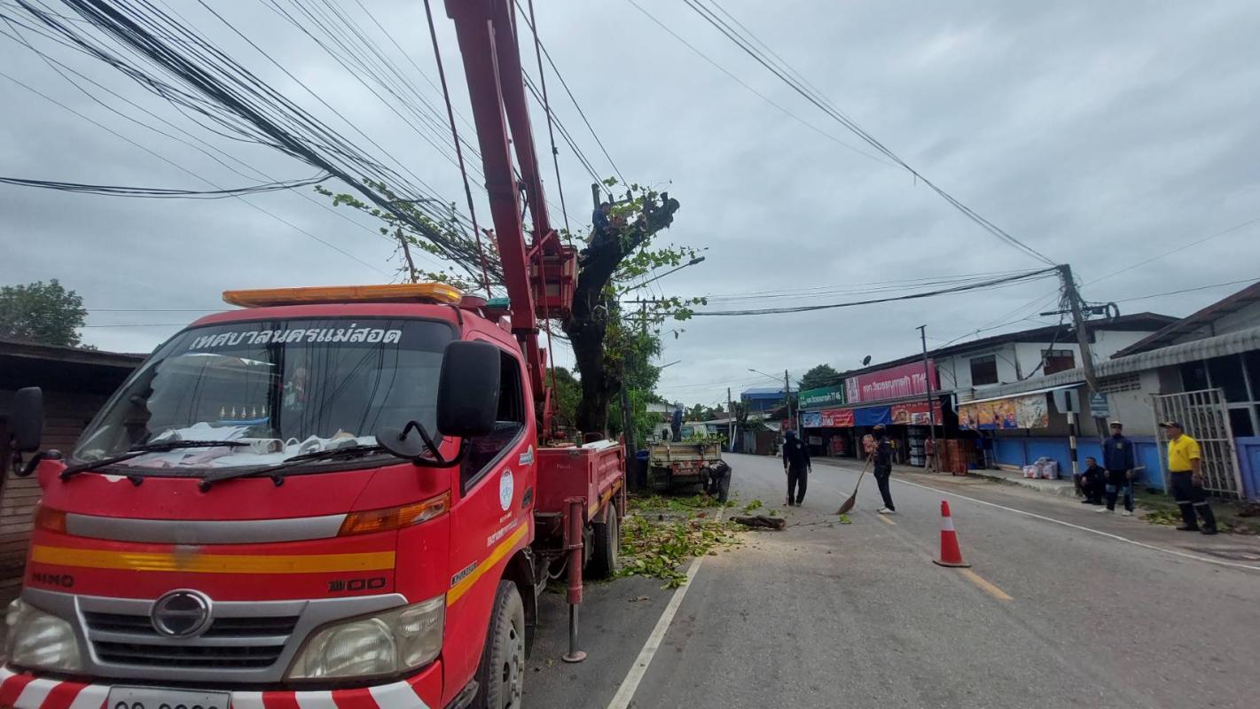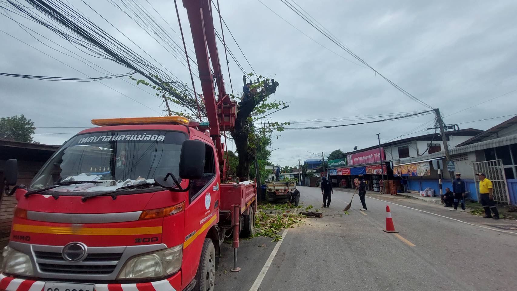 วันที่ 18 กันยายน 2566 เวลา 09.00 - 11.30 น. น.ฝ่ายป้องกันฯ นครแม่สอด ได้รับคำร้อง ขอความอนุเคราะห์ตัดต้นไม้หน้าบ้านประชาชน ตำบลแม่สอด อำเภอแม่สอด จังหวัดตาก เนื่องจากมีกิ่งไม้พาดผ่านสายไฟฟ้า เกรงว่าจะเกิดเหตุอันตราย จึงนำรถยนต์บรรทุก 6 ล้อ และอุปกรณ์ รถกระเช้า กองช่าง ดำเนินการร่วมจุดดังกล่าว โดยทำการใช้มีด เลื่อยโซ่ยนต์ ทำการตัดจนแล้วเสร็จ พร้อมยกใส่รถยนต์บรรทุกดำเนินการต่อไป เพื่อความเป็นระเบียบเรียบร้อย ความปลอดภัยแก่บ้านเรือนประชาชนที่อาศัยอยู่บริเวณดังกล่าว