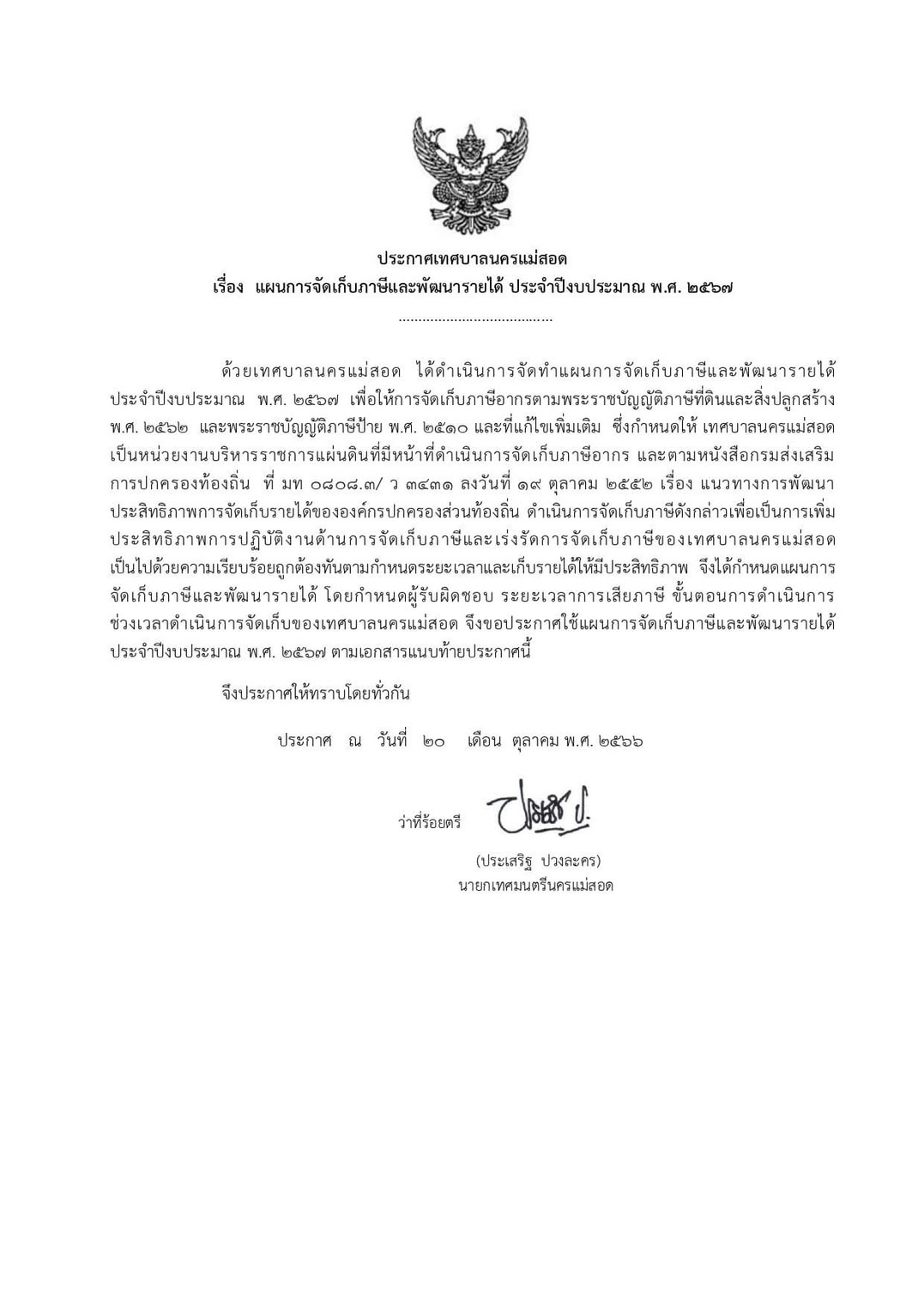 ประกาศเทศบาลนครแม่สอด เรื่อง แผนการจัดเก็บภาษีและพัฒนารายได้ ประจำปีงบประมาณ พ.ศ. 2567