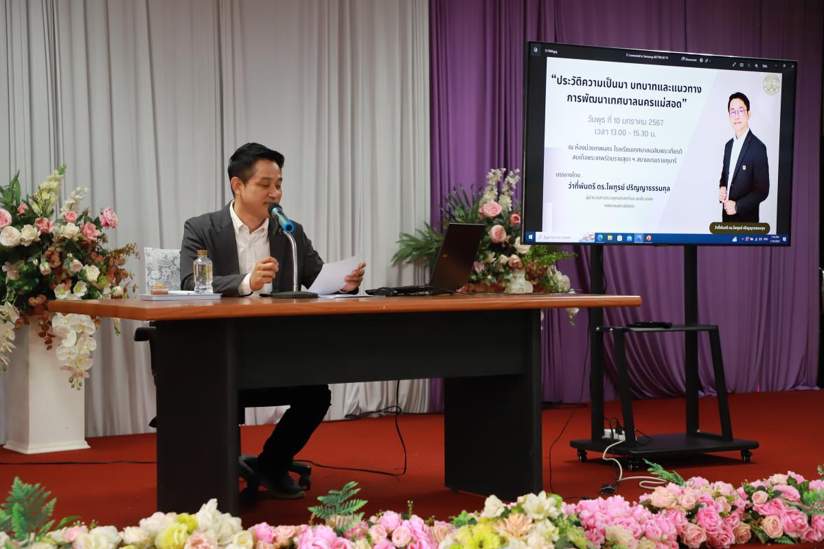 ว่าที่พันตรี ดร.ไพฑูรย์ ปริญญาธรรมกุล ผู้อำนายการกองยุทธศาสตร์และงบประมาณเทศบาลนครแม่สอด ได้รับเกียรติให้เป็นวิทยากรให้ความรู้แก่นักเรียนโรงเรียนเทศบาลเฉลิมพระเกียรติสมเด็จพระเทพรัตนราชสุดา ฯ สยามบรมราชกุมารี ในเรื่องประวัติความเป็นมา บทบาท และแนวทางการพัฒนาเทศบาลนครแม่สอด สำหรับนักเรียนระดับชั้นมัธยมศึกษาปีที่ 5 จำนวน 84 คน เพื่อส่งเสริมให้นักเรียนได้เข้าใจถึงระบบบริหารงานขององค์กรปกครองส่วนท้องถิ่น ซึ่งเป็นส่วนหนึ่งของกลุ่มสาระการเรียนรู้สังคมศึกษา ศาสนาและวัฒนธรรม
