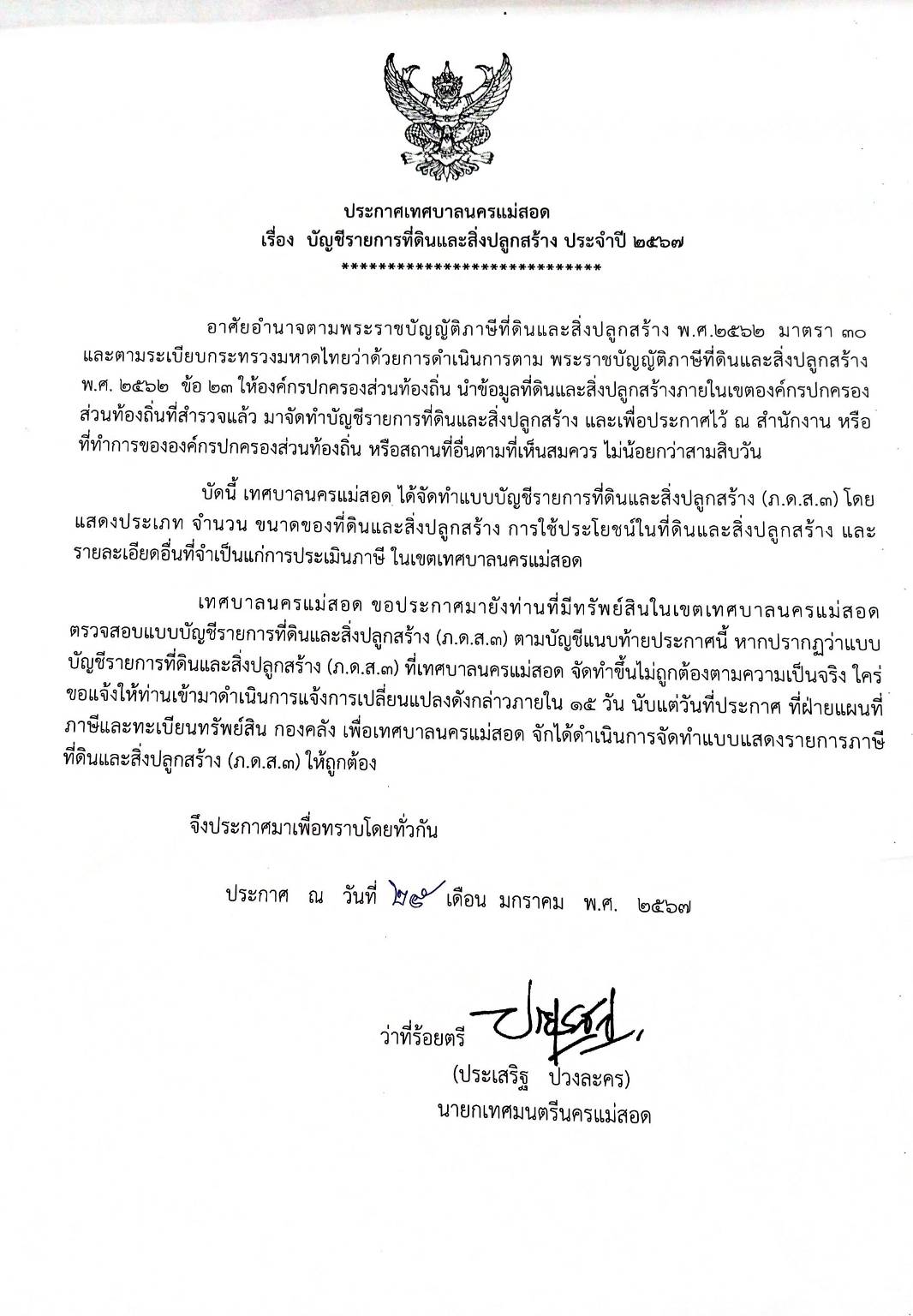 ประกาศเทศบาลนครแม่สอด เรื่อง บัญชีรายการที่ดินและสิ่งปลูกสร้าง ประจำปี 2567