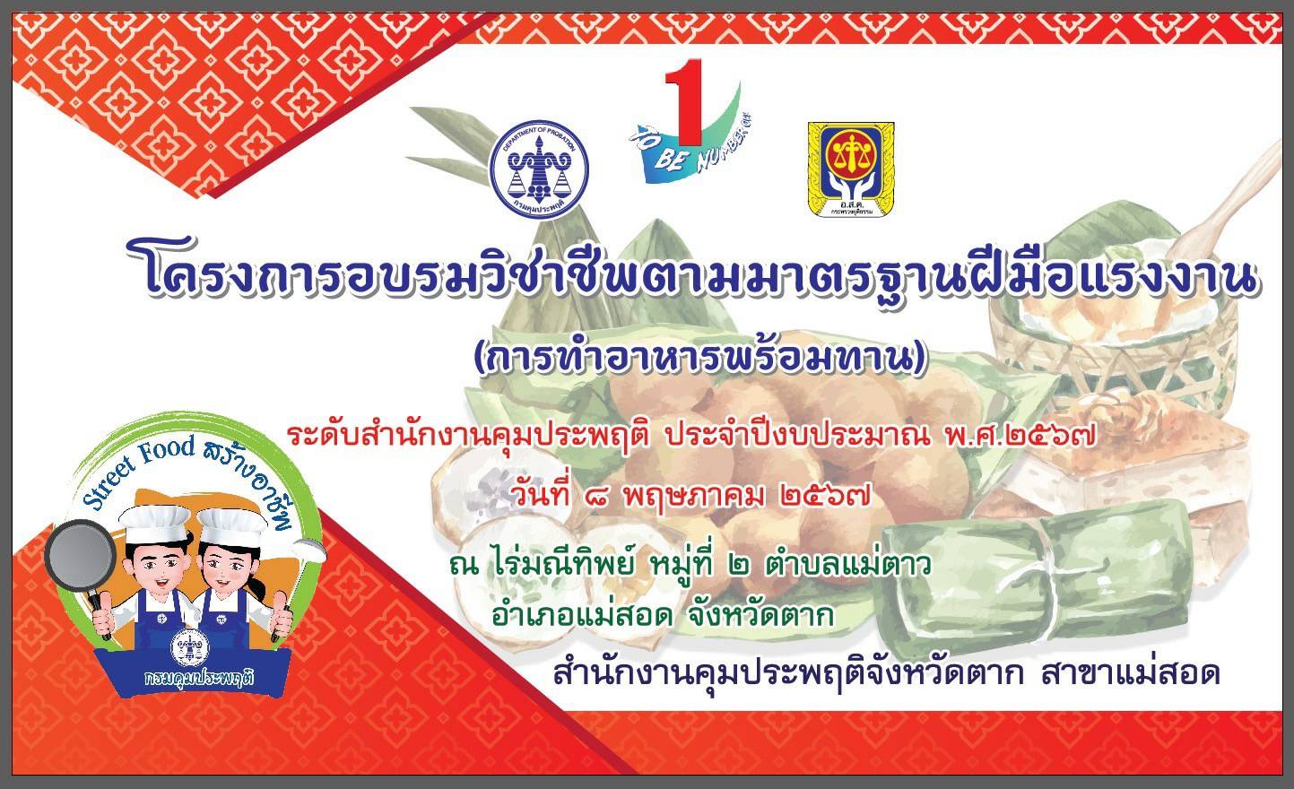 ว่าที่พันตรี ดร.ไพฑูรย์ ปริญญาธรรมกุล ผู้อำนวยการกองยุทธศาสตร์และงบประมาณ ประธานชมรมอาสาสมัครคุมประพฤติจังหวัดตาก สาขาแม่สอด เป็นประธานการประชุมคณะกรรมการ จัดการประกวดการทำอาหารพร้อมทาน (Street Food) ของผู้กระทำผิดที่อยู่ในความดูแลของสำนักงานคุมประพฤติ เพื่อเพิ่มพูนความรู้ ทักษะด้านการประกอบอาชีพ สามารถนำความรู้ไปต่อยอดในการประกอบอาชีพได้ โดยกำหนดจัดอบรมและประกวดอาหารพร้อมทาน (Street Food) ระดับสำนักงานฯ ในวันที่ 8 พฤษภาคม 2567 ณ ไร่มณีทิพย์ ต.แม่ตาว อ.แม่สอด จ.ตาก