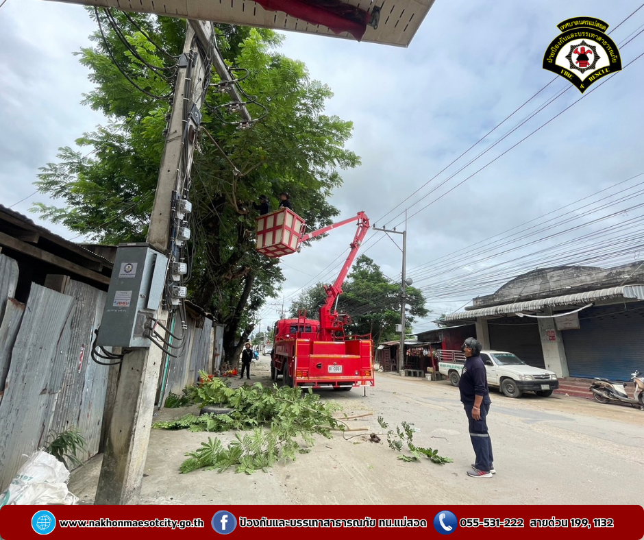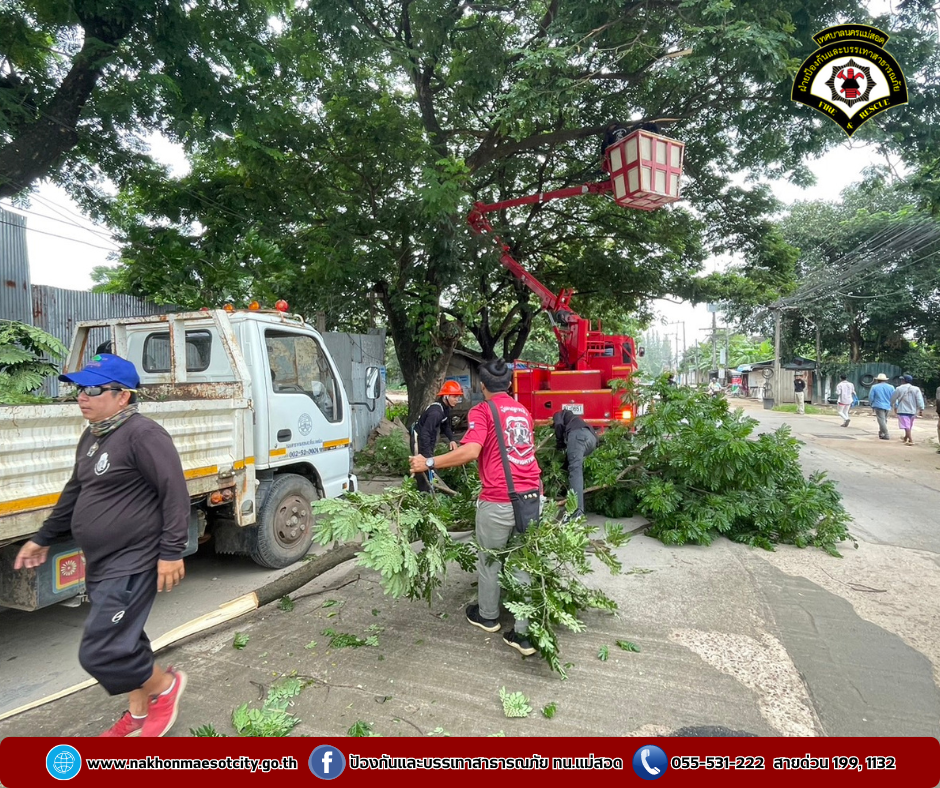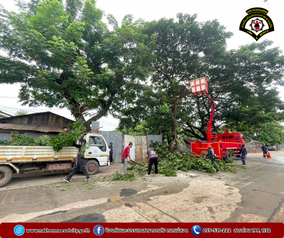 ดับเพลิงนครแม่สอด จึงนำรถยนต์บรรทุก 6 ล้อ และรถบรรทุกกระเช้าไฟฟ้า พร้อมอุปกรณ์ ดำเนินการตัดต้นไม้ดังกล่าว โดยใช้เลื่อยโซ่ยนต์ และใช้มีด ดำเนินการตัดจนแล้วเสร็จ พร้อมยกใส่รถยนต์บรรทุก 6 ล้อ ดำเนินการนำกิ่งไม้ไปทิ้งต่อไป เพื่อความเป็นระเบียบเรียบร้อย ความปลอดภัยต่อผู้ใช้รถใช้ถนน บริเวณดังกล่าว
