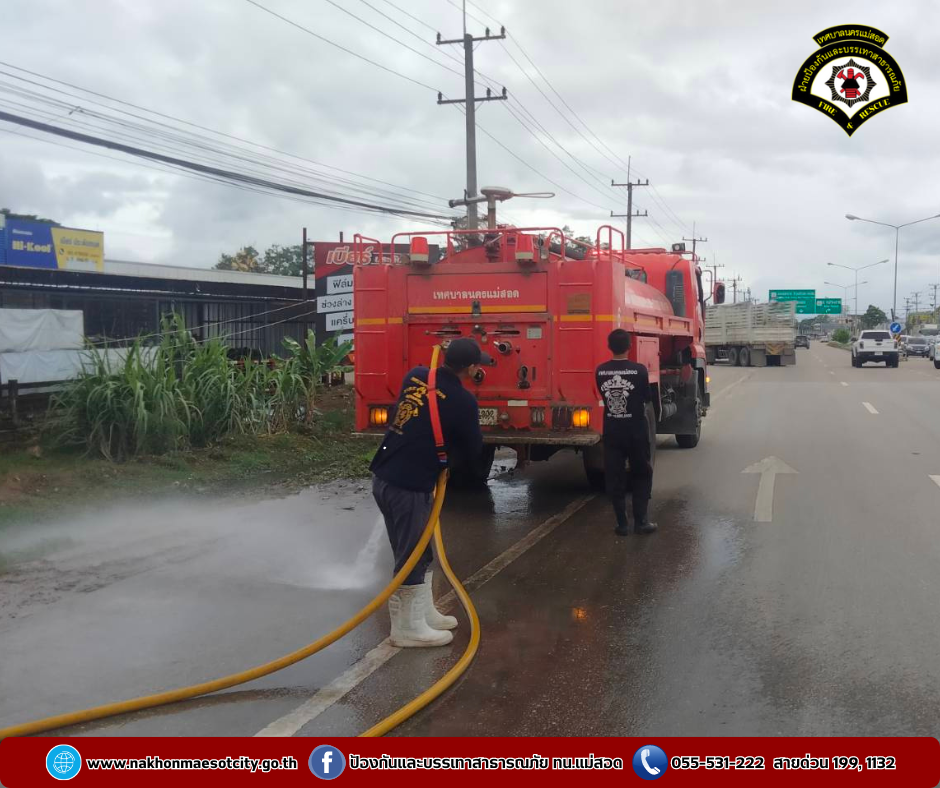 วันพฤหัสบดีที่ 18 กรกฎาคม 2567 เวลา 13.30 น. ดับเพลิงนครแม่สอด นำรถยนต์บรรทุกน้ำดับเพลิง จำนวน 1 คัน ออกดำเนินการฉีดล้างทำความสะอาด บริเวณถนนสายเอเซีย แยกเอเซียการยาง อำเภอแม่สอด จังหวัดตาก ตามคำร้องขอความอนุเคราะห์ฯ เพื่อขจัดเศษ หิน ดิน ทราย รวมถึงสิ่งปนเปื้อนบนพื้นผิวถนน