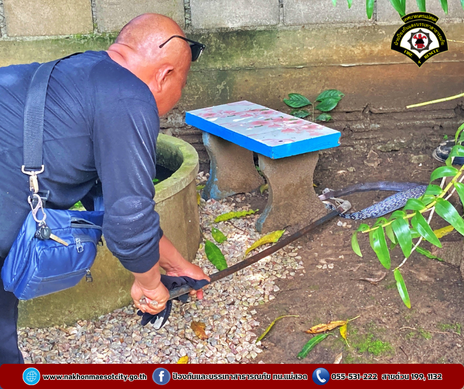 ดับเพลิงนครแม่สอด จึงได้นำรถยนต์ตรวจการณ์เคลื่อนที่เร็ว และอุปกรณ์สำหรับจับสัตว์เลื้อยคลาน ออกตรวจสอบ ณ ที่เกิดเหตุ พบสัตว์เลื้อยคลาน (งู) จึงได้ดำเนินการจับ และได้นำไปปล่อยคืนสู่ธรรมชาติ พื้นที่ห่างไกลชุมชนต่อไป