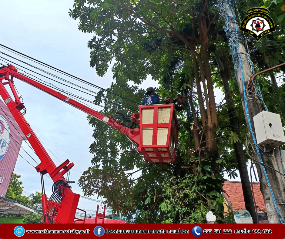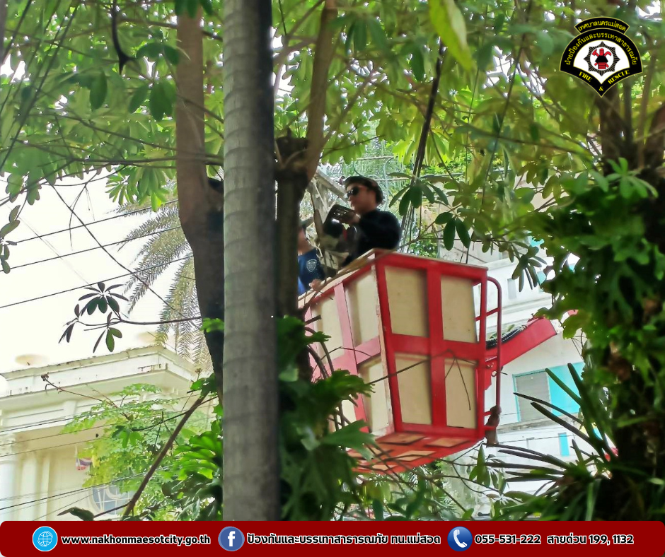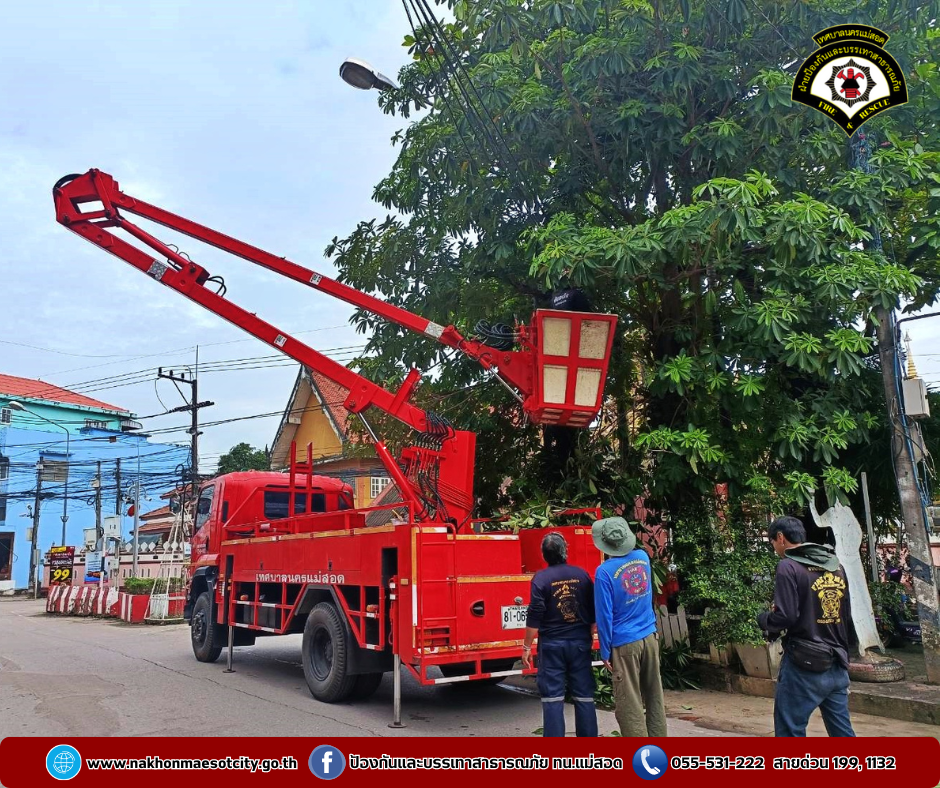 ดับเพลิงนครแม่สอด จึงนำรถยนต์บรรทุก 6 ล้อ และรถบรรทุกกระเช้าไฟฟ้า พร้อมอุปกรณ์ ออกดำเนินการตัดแต่งกิ่งไม้ดังกล่าว โดยใช้เลื่อยโซ่ยนต์ และใช้มีด ดำเนินการตัดจนแล้วเสร็จ พร้อมยกใส่รถยนต์บรรทุก 6 ล้อ ดำเนินการนำกิ่งไม้ไปทิ้งต่อไป เพื่อความเป็นระเบียบเรียบร้อย ความปลอดภัยต่อผู้ใช้รถใช้ถนน บริเวณดังกล่าว