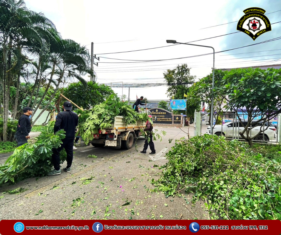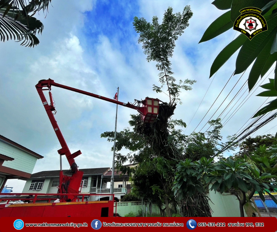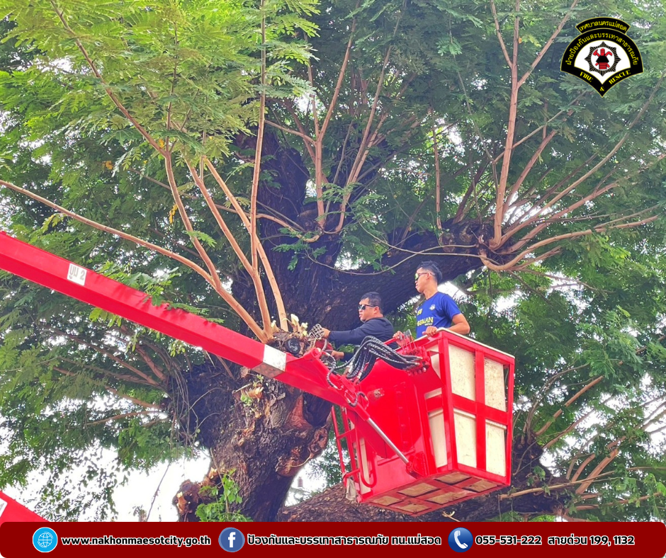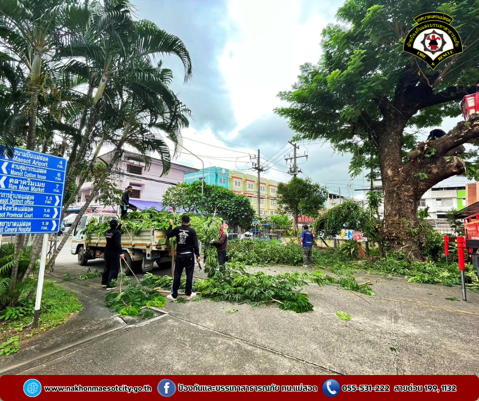 ดับเพลิงนครแม่สอด จึงนำรถยนต์บรรทุก 6 ล้อ และรถบรรทุกกระเช้าไฟฟ้า พร้อมอุปกรณ์ ออกดำเนินการตัดแต่งกิ่งไม้ดังกล่าว โดยใช้เลื่อยโซ่ยนต์ และใช้มีด ดำเนินการตัดจนแล้วเสร็จ พร้อมยกใส่รถยนต์บรรทุก 6 ล้อ ดำเนินการนำกิ่งไม้ไปทิ้งต่อไป เพื่อความเป็นระเบียบเรียบร้อย ความปลอดภัยต่อผู้ใช้รถใช้ถนน บริเวณดังกล่าว