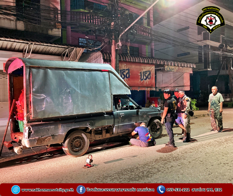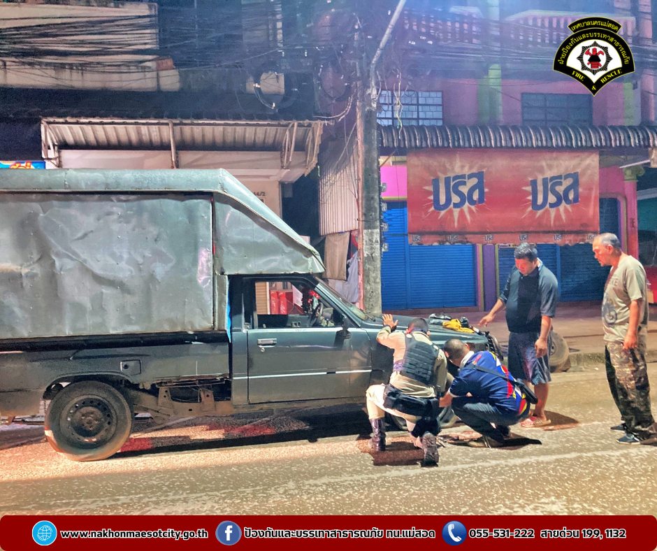 ดับเพลิงนครแม่สอด จึงได้นำรถยนต์กู้ภัยเคลื่อนที่เร็ว และอุปกรณ์สำหรับเปลี่ยนยางรถ ร่วมอาสาสมัครป้องกันภัยฝ่ายพลเรือน ออกตรวจสอบ ณ ที่เกิดเหตุ พอถึงที่เกิดเหตุพบรถยนต์กระบะ (ตู้ทึบ) ยี่ห้อโตโยต้า จอดรอการช่วยเหลือ พนักงานดับเพลิงจึงได้ทำการช่วยเหลือ โดยการเปลี่ยนยางรถ จนดำเนินการเเล้วเสร็จ