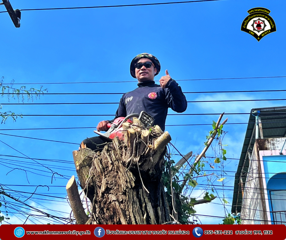 ดับเพลิงนครแม่สอด จึงนำรถยนต์บรรทุก 6 ล้อ และรถบรรทุกกระเช้าไฟฟ้า พร้อมอุปกรณ์ ดำเนินการตัดต้นไม้ดังกล่าว โดยใช้เลื่อยโซ่ยนต์ และใช้มีด ดำเนินการตัดจนแล้วเสร็จ พร้อมยกใส่รถยนต์บรรทุก 6 ล้อ ดำเนินการนำกิ่งไม้ไปทิ้งต่อไป เพื่อความเป็นระเบียบเรียบร้อย ความปลอดภัยต่อผู้ใช้รถใช้ถนน บริเวณดังกล่าว