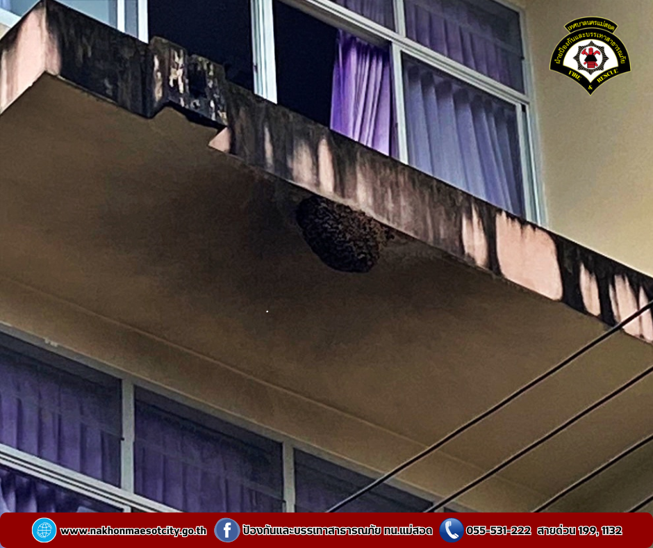 ดับเพลิงนครแม่สอด จึงนำรถยนต์ตรวจการณ์เคลื่อนที่เร็ว พร้อมเตรียมอุปกรณ์ ออกดำเนินการตรวจสอบ ณ พื้นที่ พบรังผึ้งเกาะระเบียงสูง เจ้าหน้าที่จึงได้ทำการกำจัด โดยใช้วิธีการเผาจนแล้วเสร็จ เพื่อเป็นการป้องกันผึ้งแตกรังต่อยนักเรียนและครู