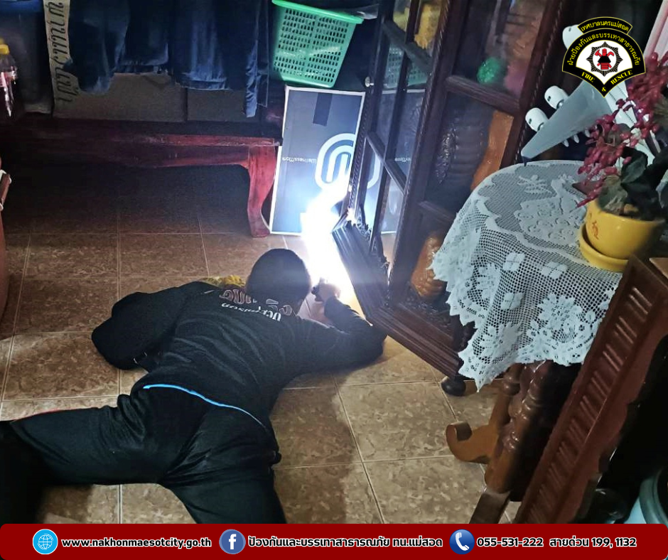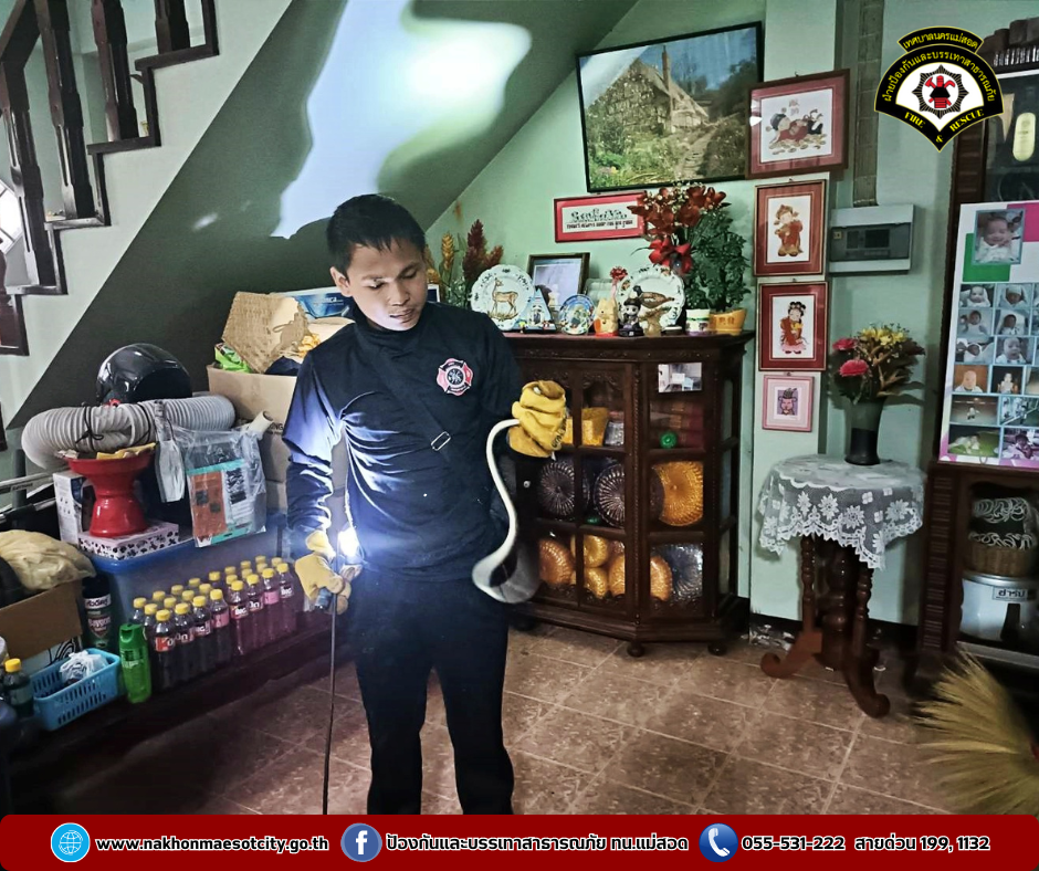 ดับเพลิงนครแม่สอด จึงได้นำรถยนต์ตรวจการณ์เคลื่อนที่เร็ว และอุปกรณ์สำหรับจับสัตว์เลื้อยคลาน ออกตรวจสอบ ณ ที่เกิดเหตุ พบสัตว์เลื้อยคลาน (งู) จึงได้ดำเนินการจับ และได้นำไปปล่อยคืนสู่ธรรมชาติ พื้นที่ห่างไกลชุมชนต่อไป