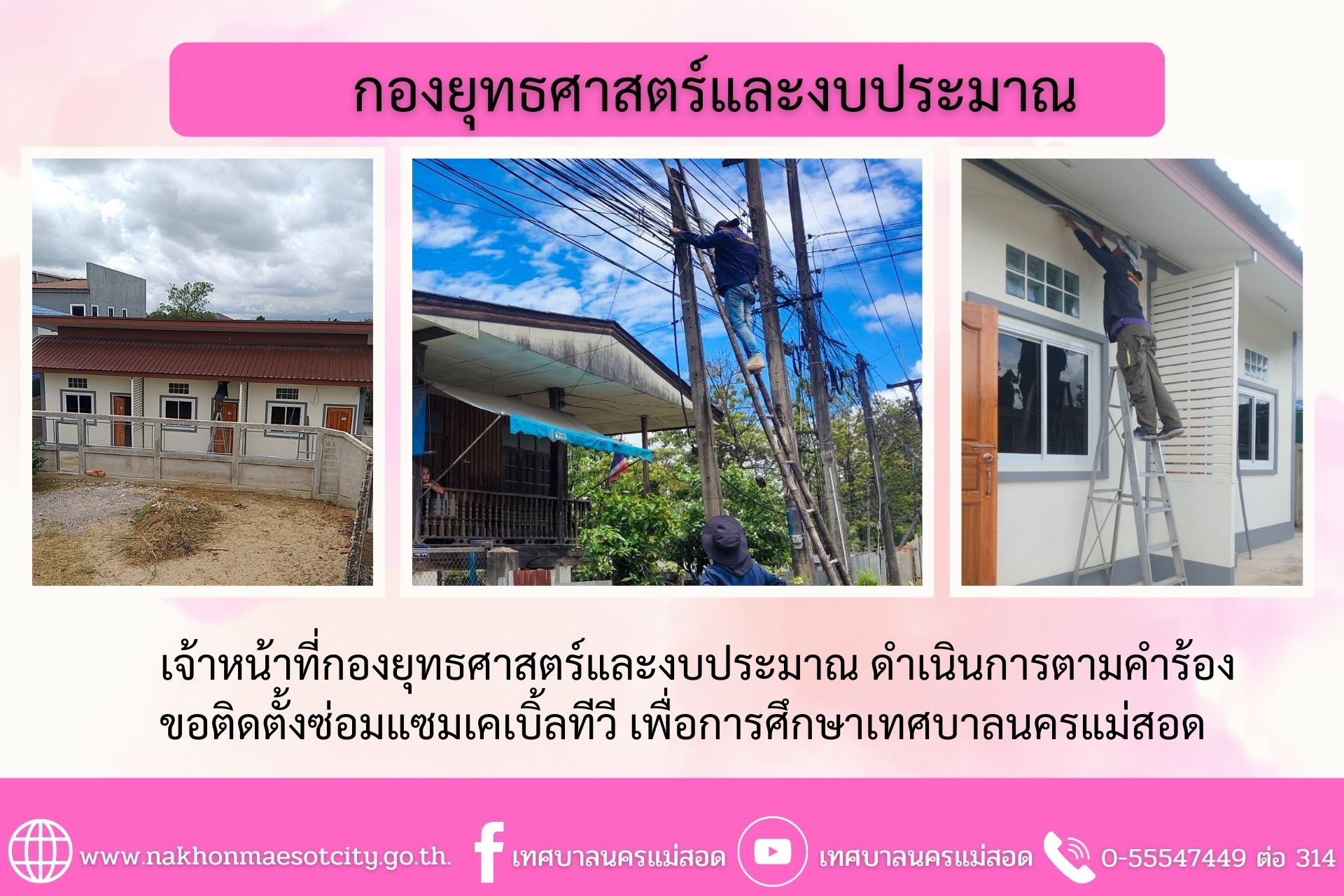 เมื่อวันพุธ ที่ 28 สิงหาคม 2567 ว่าที่พันตรี ดร.ไพฑูรย์ ปริญญาธรรมกุล ผู้อำนวยการกองยุทธศาสตร์และงบประมาณ มอบหมายให้ เจ้าหน้าที่ฝ่ายวิเทศสัมพันธ์ กองยุทธศาสตร์และงบประมาณ ลงพื้นที่ดำเนินการตามคำร้องขอติดตั้งซ่อมแซมเคเบิ้ลทีวี เพื่อการศึกษาเทศบาลนครแม่สอด