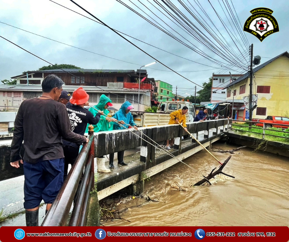 วันอังคารที่ 10 กันยายน 2567 เวลา 16.50 น. ว่าที่ร้อยตรี ประเสริฐ ปวงละคร นายกเทศมนตรีนครแม่สอด มอบหมายให้ดับเพลิงนครแม่สอด นำรถยนต์บรรทุก 6 ล้อ รถยนต์ตรวจการณ์ และรถยนต์กู้ภัยเคลื่อนที่เร็ว พร้อมอุปกรณ์ ออกดำเนินการเก็บกิ่งไม้ขึ้นมาจากคลองแม่สอด เพื่อไม่ให้ขวางทางไหลคลองน้ำ และเพื่อความสะอาด สวยงามของพื้นที่ รวมถึงการป้องกันน้ำท่วมเอ่อล้นสะพาน บริเวณสะพานจ๊อกจอ อำเภอแม่สอด จังหวัดตาก