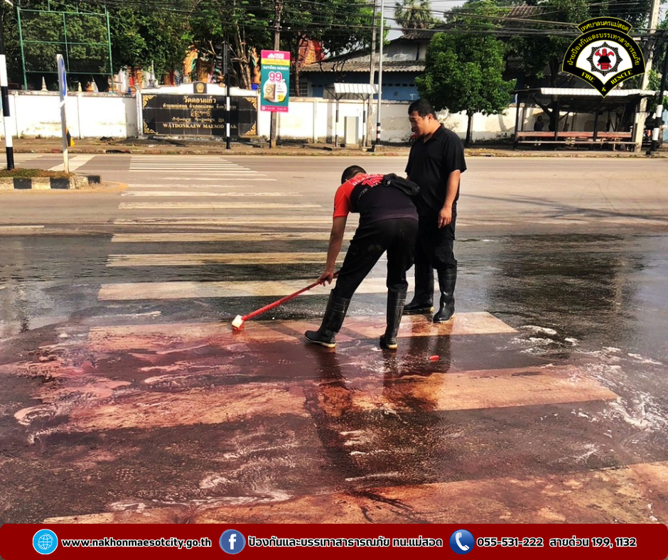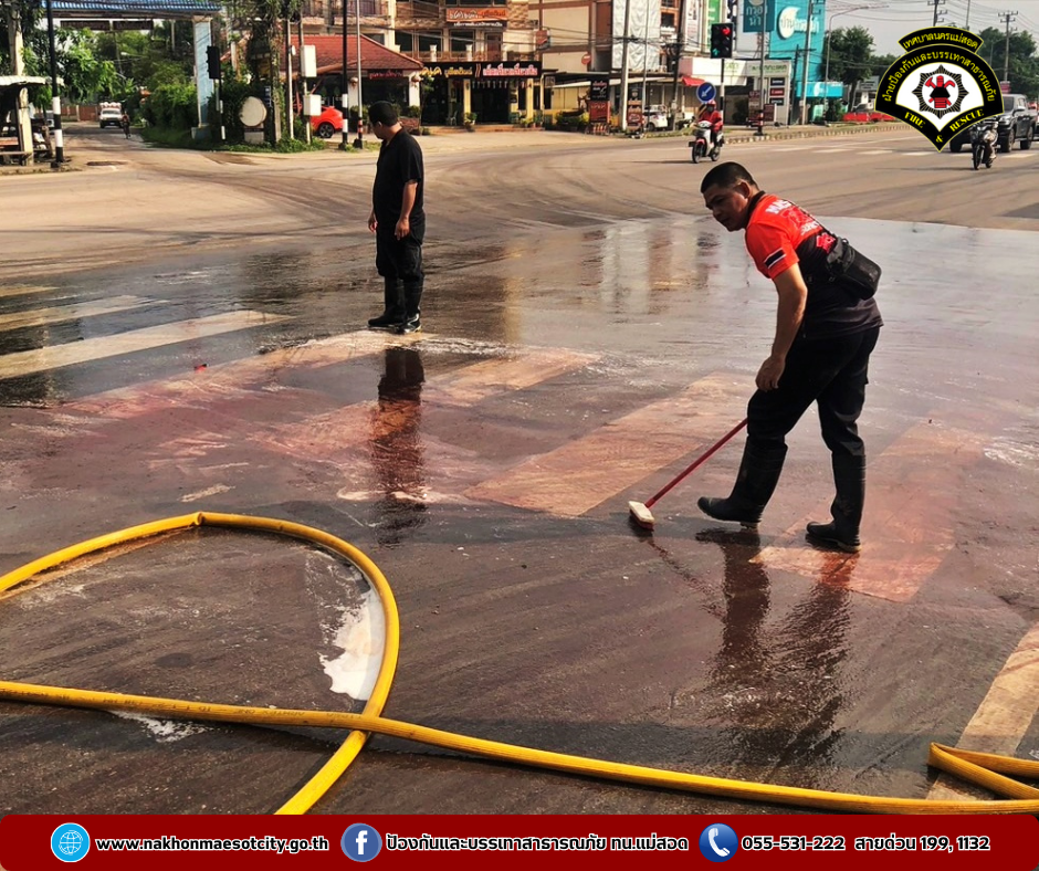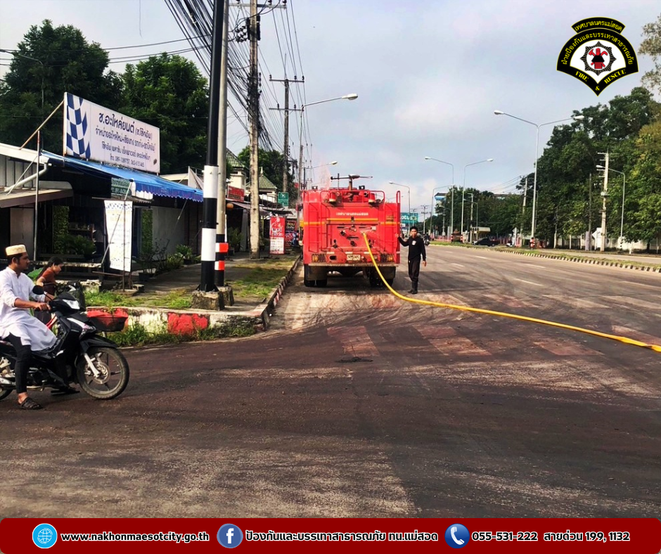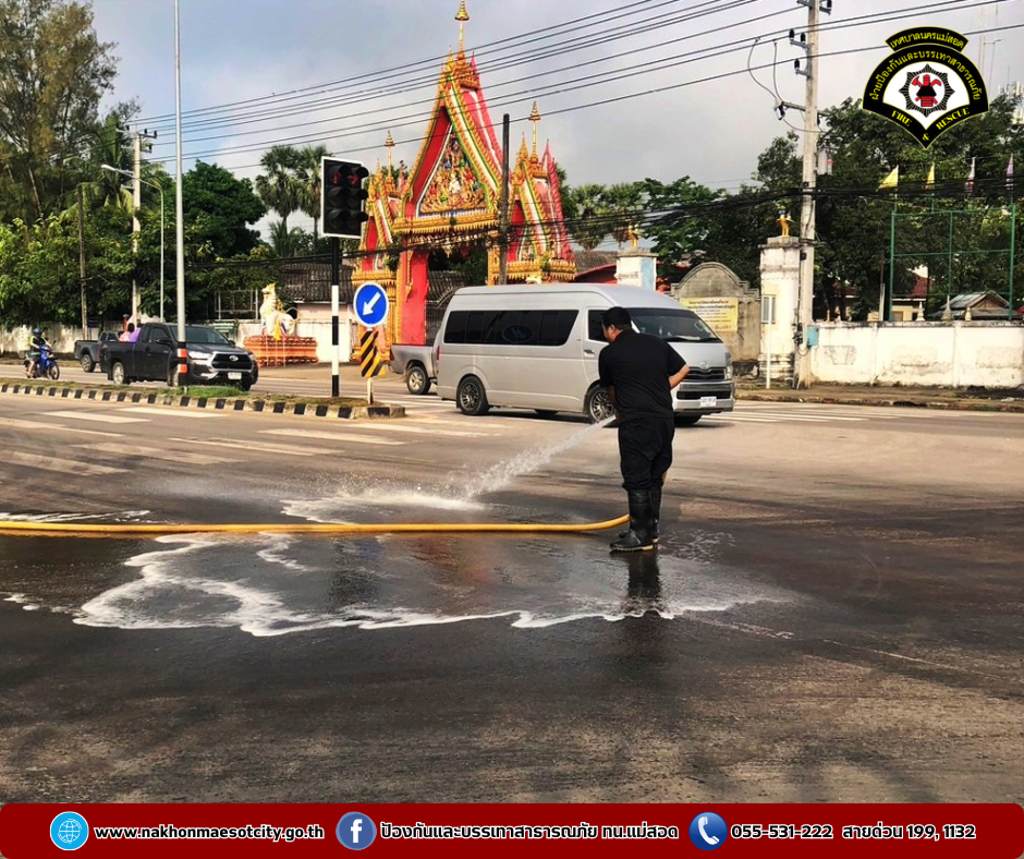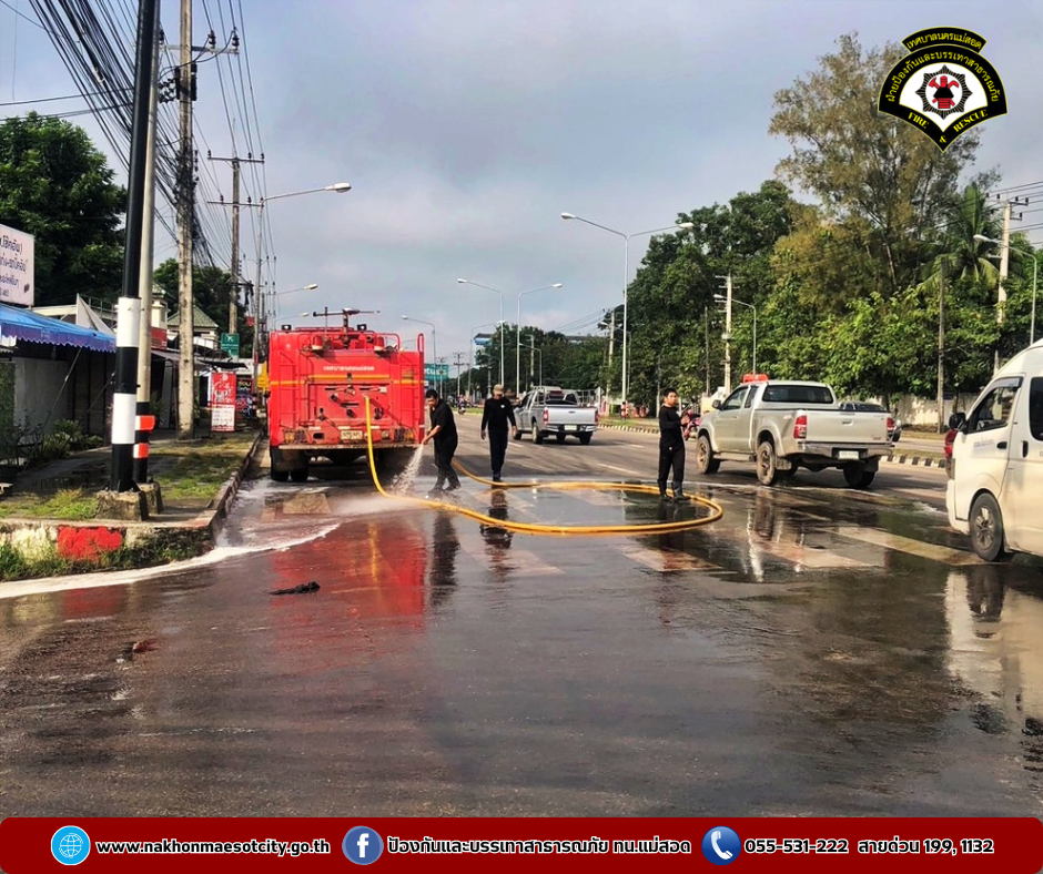 วันอาทิตย์ที่ 6 ตุลาคม 2567 เวลา 09.00 น. ว่าที่ร้อยตรี ประเสริฐ ปวงละคร นายกเทศมนตรีนครแม่สอด มอบหมายให้ดับเพลิงนครแม่สอด นำรถยนต์บรรทุกน้ำดับเพลิง จำนวน 1 คัน พร้อมเจ้าหน้าที่ ออกดำเนินการฉีดล้างทำความสะอาดถนน เนื่องจากถนนลื่น บริเวณแยกดอนแก้ว ตำบลแม่สอด อำเภอแม่สอด จังหวัดตาก เพื่อเป็นการทำความสะอาด ระเบียบเรียบร้อย