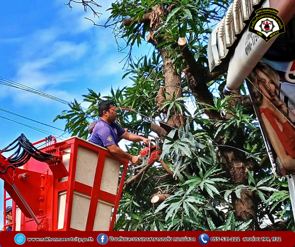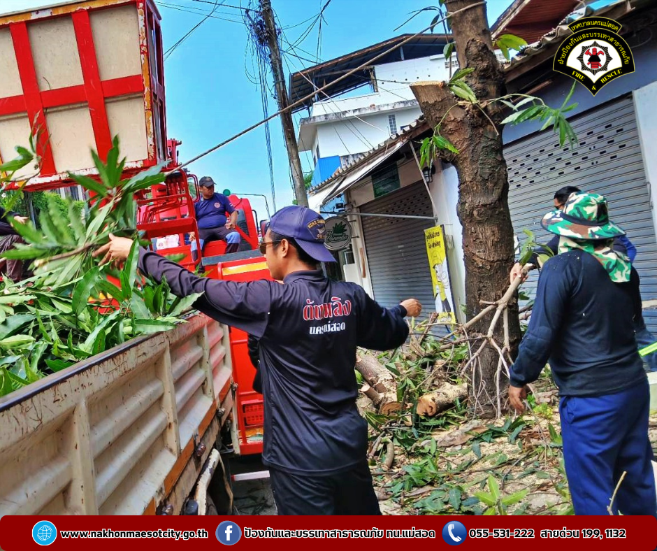 ดับเพลิงนครแม่สอด จึงนำรถยนต์บรรทุก 6 ล้อ และรถบรรทุกกระเช้าไฟฟ้า พร้อมอุปกรณ์ ดำเนินการตัดต้นไม้ดังกล่าว โดยใช้เลื่อยโซ่ยนต์ และใช้มีด ดำเนินการตัดจนแล้วเสร็จ พร้อมยกใส่รถยนต์บรรทุก 6 ล้อ ดำเนินการนำกิ่งไม้ไปทิ้งต่อไป เพื่อความเป็นระเบียบเรียบร้อย และความปลอดภัย บริเวณดังกล่าว