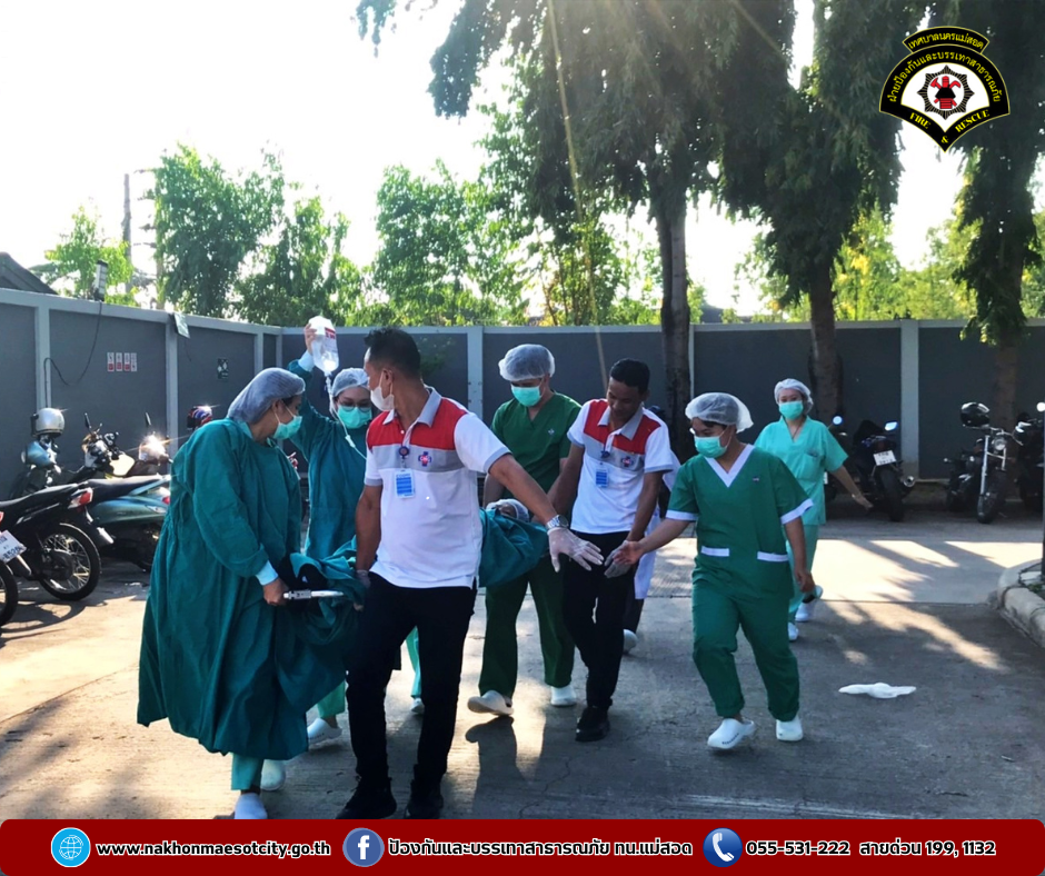 ซึ่งการฝึกซ้อมแผนฯ สมมติสถานการณ์เหตุเพลิงไหม้ที่ตู้นึ่งเครื่องมือแพทย์ ภายในแผนกจ่ายกลาง ชั้น 2 ดำเนินการช่วยเหลือโดยใช้รถยนต์บรรทุกน้ำดับเพลิง ระงับเหตุเพลิงไหม้ การไฟฟ้าตัดกระแสไฟ ทดสอบระบบหัวรับน้ำ และ Fire Pump ของโรงพยาบาลแม่สอด มีผู้เข้าร่วมการฝึกอพยพ จำนวน 200 คน