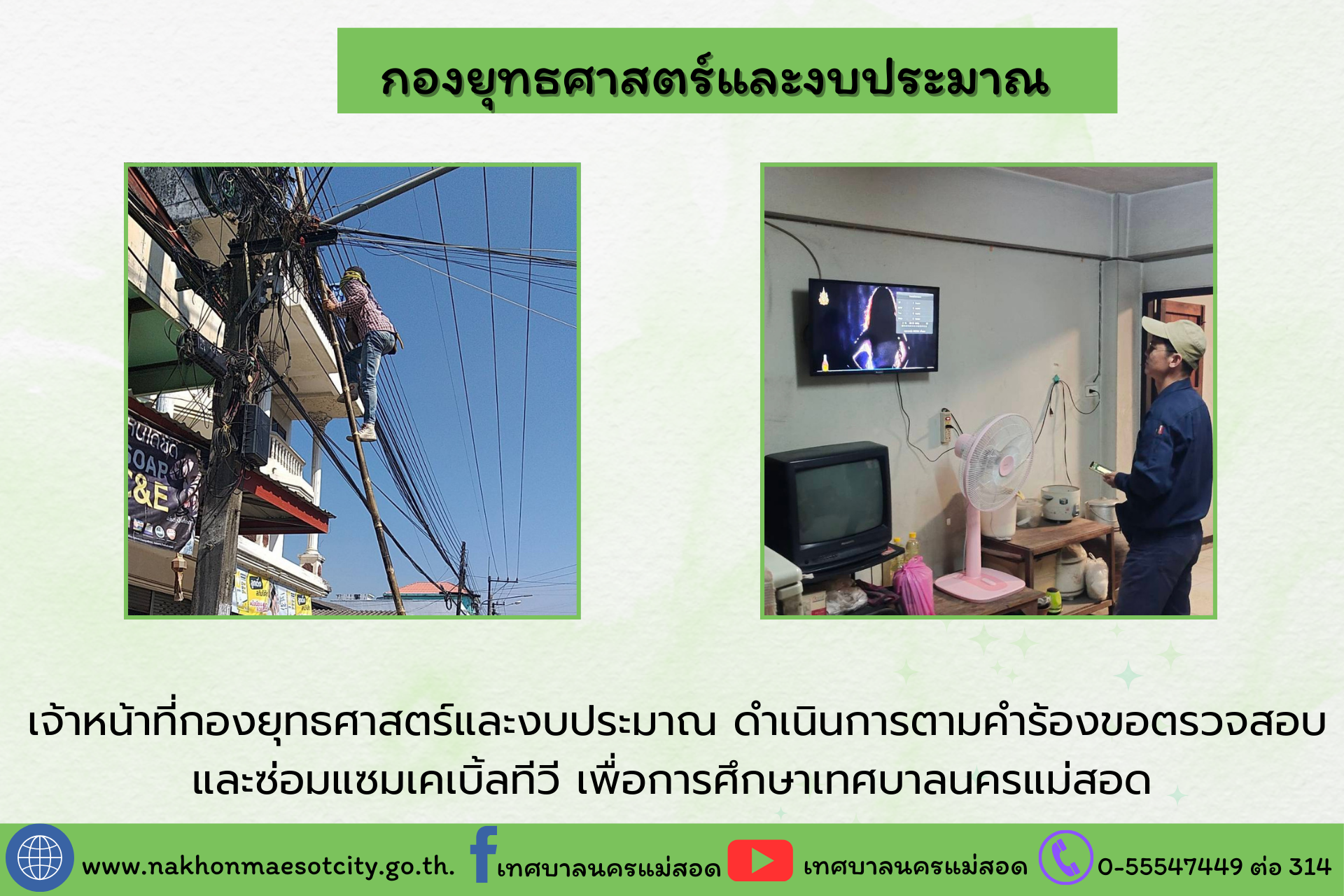 เมื่อวันพุธ ที่ 4 ธันวาคม 2567 ว่าที่พันตรี ดร.ไพฑูรย์ ปริญญาธรรมกุล ผู้อำนวยการกองยุทธศาสตร์และงบประมาณ มอบหมายให้ เจ้าหน้าที่ฝ่ายวิเทศสัมพันธ์ กองยุทธศาสตร์และงบประมาณ ลงพื้นที่ดำเนินการตามคำร้องขอติดตั้งและซ่อมแซมเคเบิ้ลทีวี เพื่อการศึกษาเทศบาลนครแม่สอด