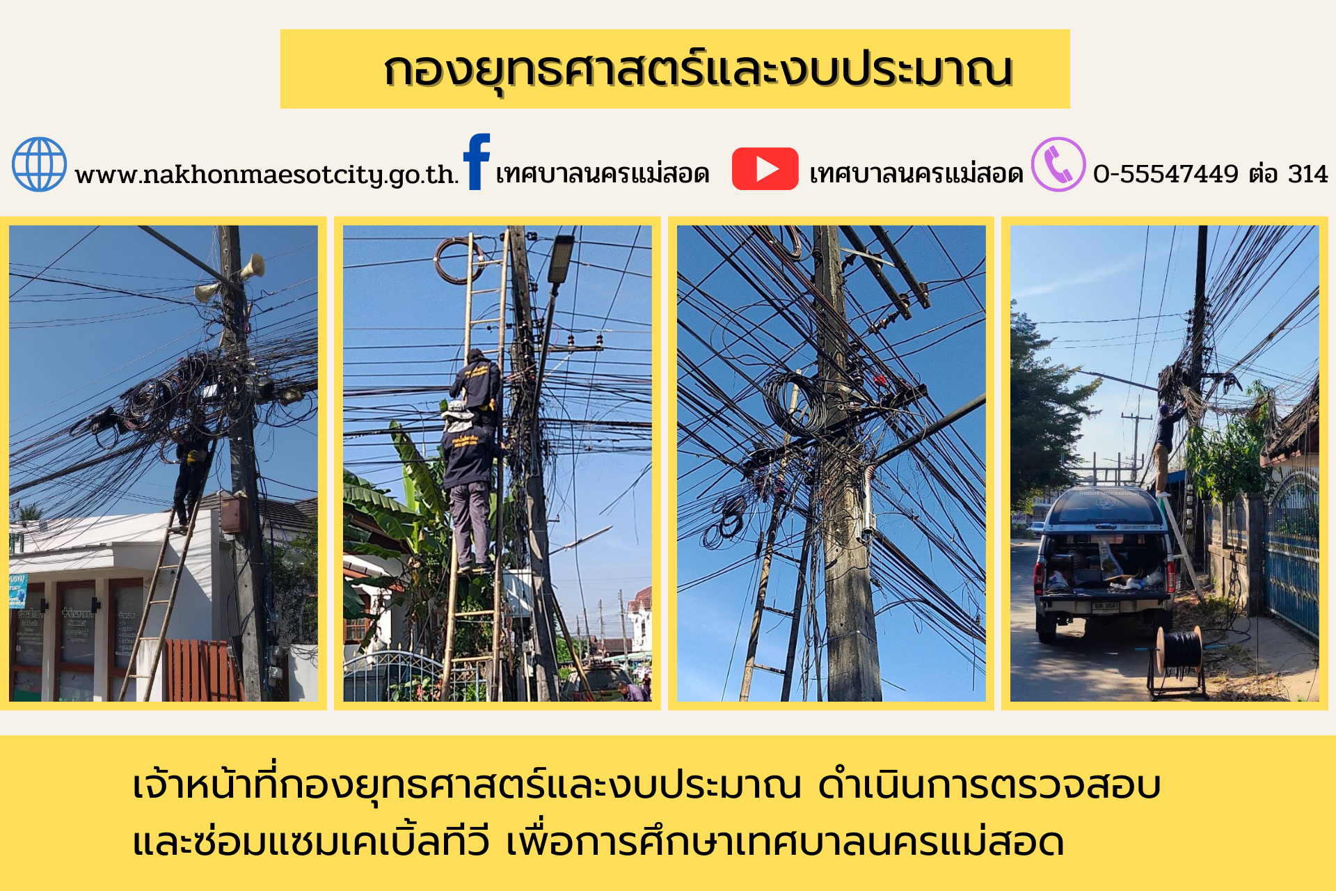 เมื่อวันจันทร์ ที่ 9 ธันวาคม 2567 ว่าที่พันตรี ดร.ไพฑูรย์ ปริญญาธรรมกุล ผู้อำนวยการกองยุทธศาสตร์และงบประมาณ มอบหมายให้ เจ้าหน้าที่ฝ่ายวิเทศสัมพันธ์ กองยุทธศาสตร์และงบประมาณ ลงพื้นที่ดำเนินการตามคำร้องขอติดตั้งและซ่อมแซมเคเบิ้ลทีวี เพื่อการศึกษาเทศบาลนครแม่สอด
