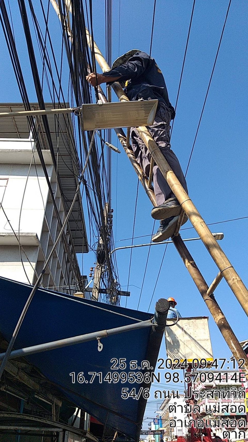 ลงพื้นที่ดำเนินการติดตั้งและซ่อมแซมเคเบิ้ลทีวี เหตุเพลิงไหม้เสาไฟหน้าตลาดโต้รุ่ง ในชุมชนวัดหลวง