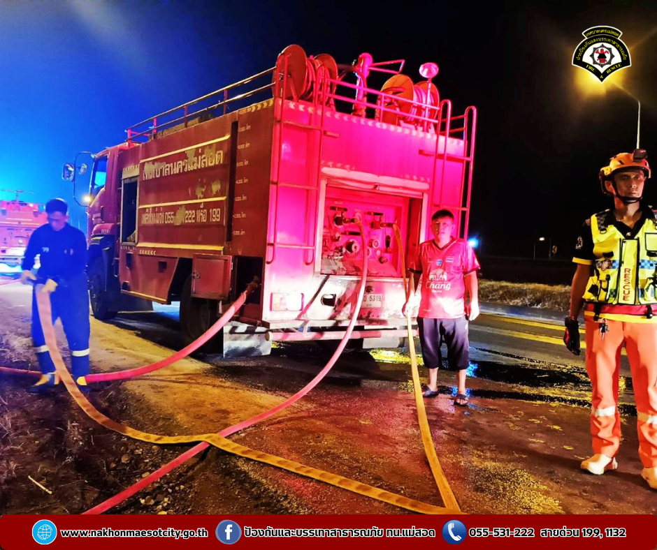 ฝ่ายป้องกันและบรรเทาสาธารณภัย เทศบาลนครแม่สอด จึงรายงานต่อ ว่าที่ร้อยตรีประเสริฐ ปวงละคร นายกเทศมนตรีนครแม่สอดทราบ และได้นำรถยนต์ดับเพลิง จำนวน 2 คัน, รถยนต์บรรทุกน้ำดับเพลิง จำนวน 4 คัน และรถยนต์กู้ภัยเคลื่อนที่เร็ว จำนวน 1 คัน พร้อมทีมนักผจญเพลิง ร่วมกับงานป้องกันและบรรเทาสาธารณภัยจากหน่วยใกล้เคียง, ฝ่ายปกครองอำเภอแม่สอด, ฉก.ราชมนู, แขวงทางหลวงตากที่ 2 (แม่สอด), สมาคม