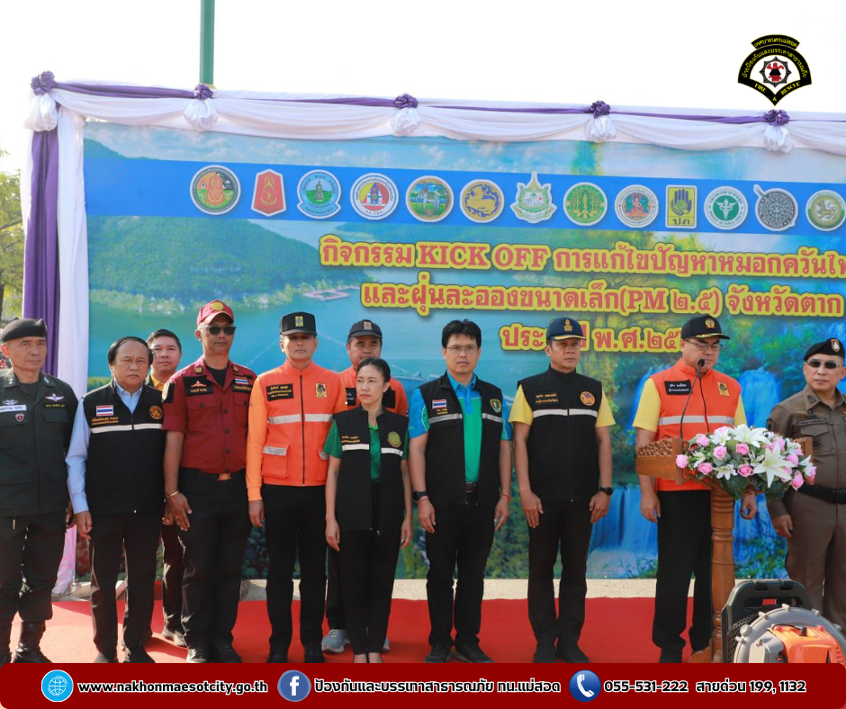 ว่าที่ร้อยตรี ประเสริฐ ปวงละคร นายกเทศมนตรีนครแม่สอด พร้อมด้วย คณะผู้บริหาร สมาชิกสภาเทศบาล และเจ้าหน้าที่ฝ่ายป้องกันและบรรเทาสาธารณภัยเทศบาลนครแม่สอด พร้อมรถดับเพลิงบรรทุกน้ำ เข้าร่วมการจัดกิจกรรม KICK OFF การแก้ไขปัญหาหมอกควันไฟป่าและฝุ่นละอองขนาดเล็ก (PM 2.5) จังหวัดตาก ประจำปี พ.ศ.2568 โดยมี นายชูชีพ พงษ์ไชยผู้ว่าราชการจังหวัดตาก เป็นประธานในพิธีเปิด และมีนายนิรุทร์ สาธุวงษ์ หัวหน้าสำนักงานป้องกันและบรรเทาสาธารณภัยจังหวัดตาก เป็นผู้กล่าวรายงาน โดยมีผู้เข้าร่วมกิจกรรมในครั้งนี้ จำนวน 500 คน