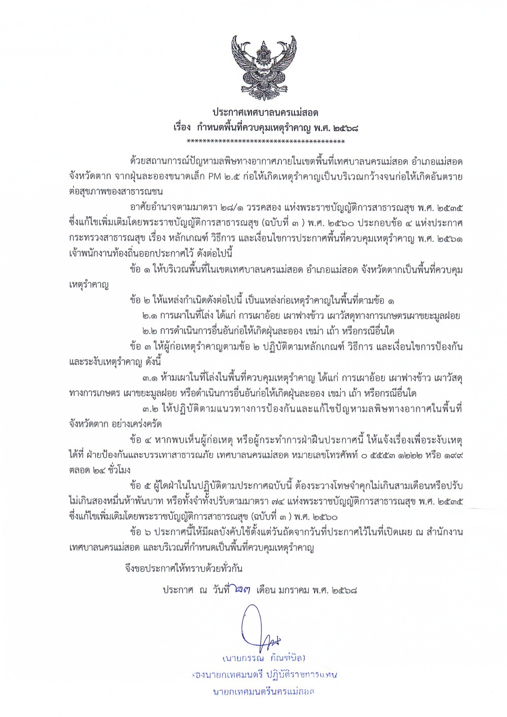 ประกาศเทศบาลนครแม่สอด เรื่อง กำหนดพื้นที่ควบคุมเหตุรำคาญ พ.ศ. 2568