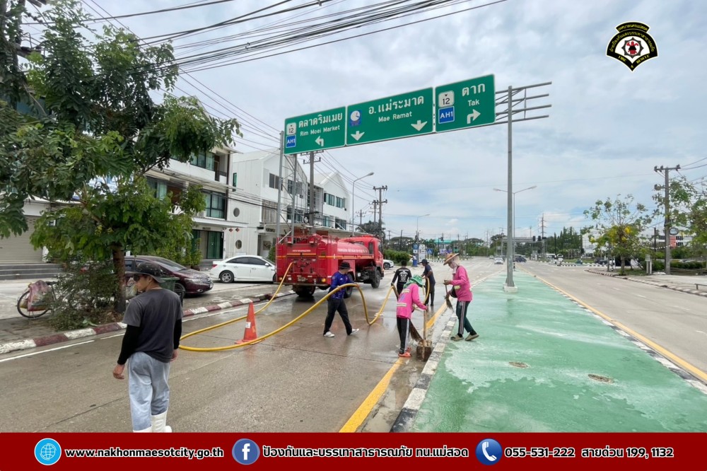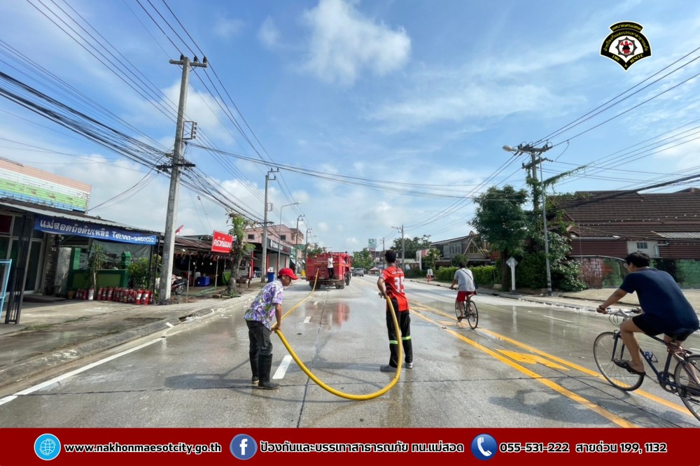 ดับเพลิงนครแม่สอด ฉีดล้างทำความสะอาดถนน บริเวณใกล้เคียงศรีสวัสดิ์ สาขาหน้าโรงพยาบาลแม่สอด ถนนแม่สอด-แม่ตาว