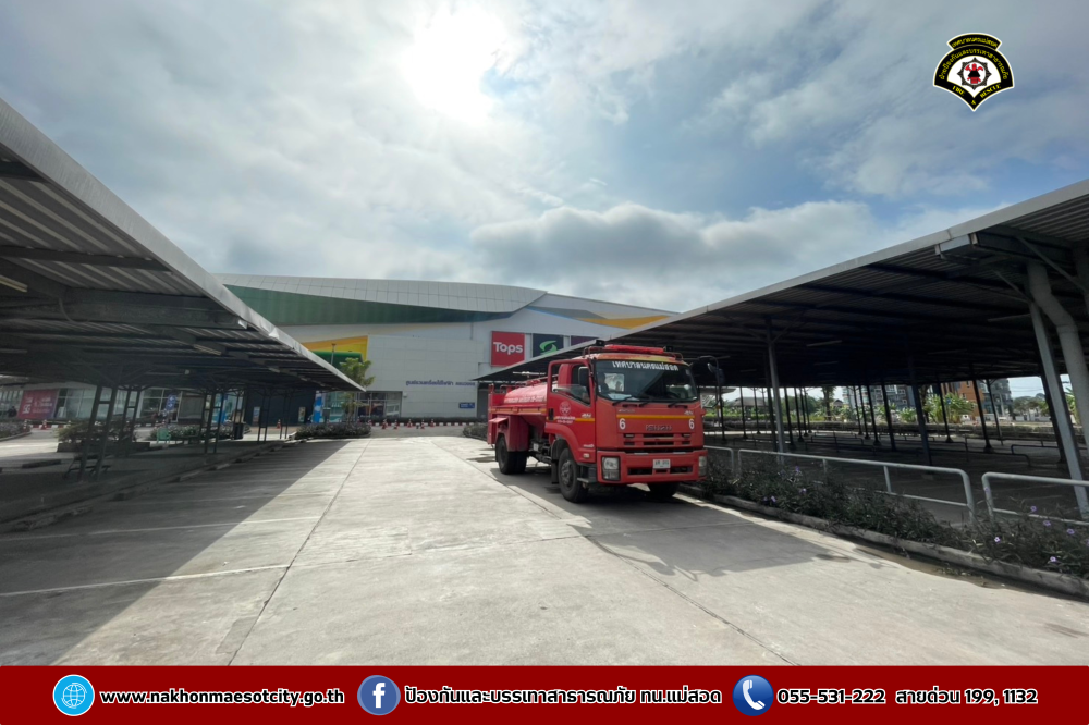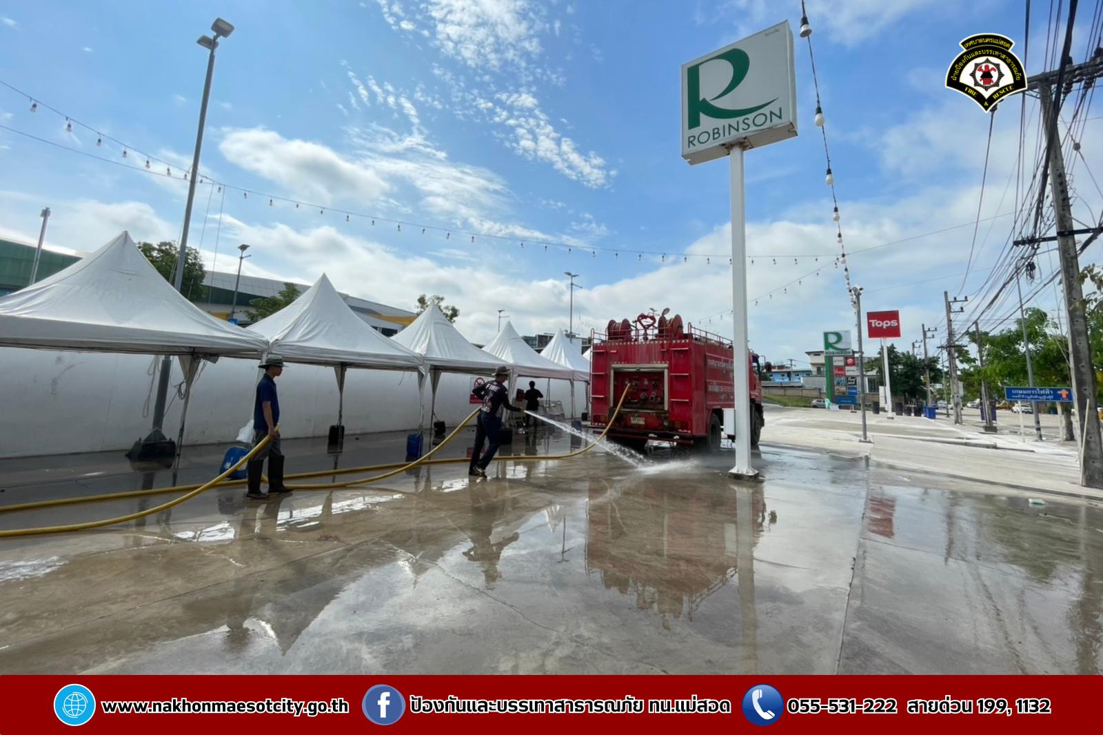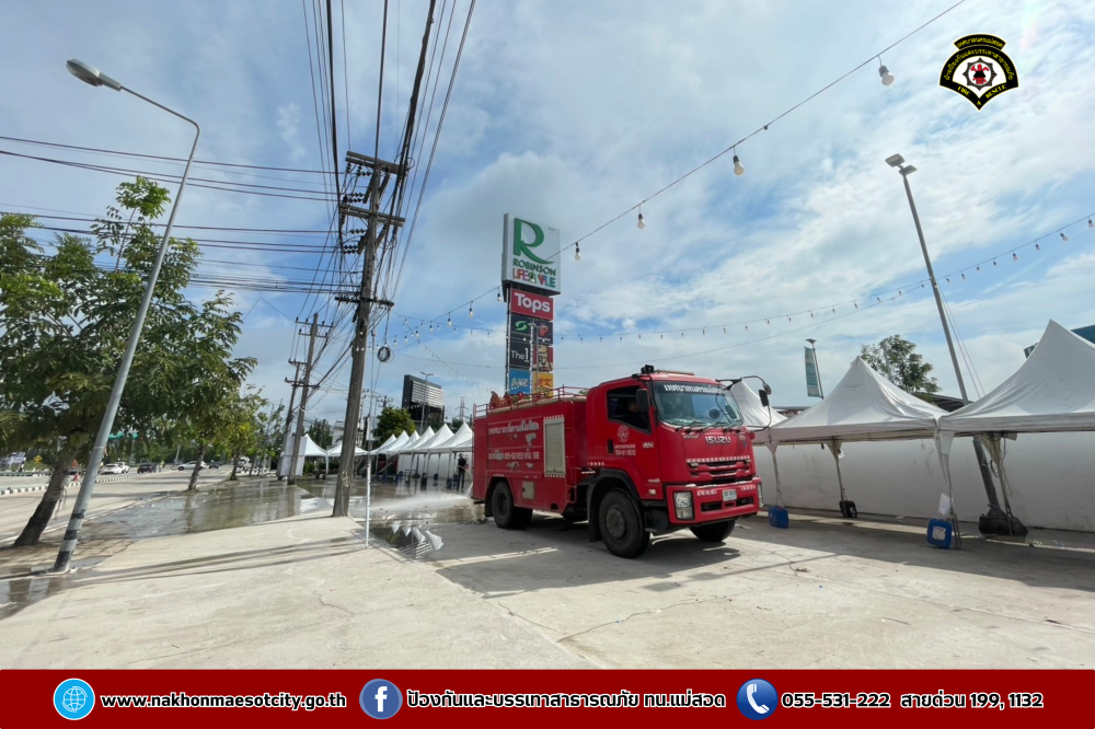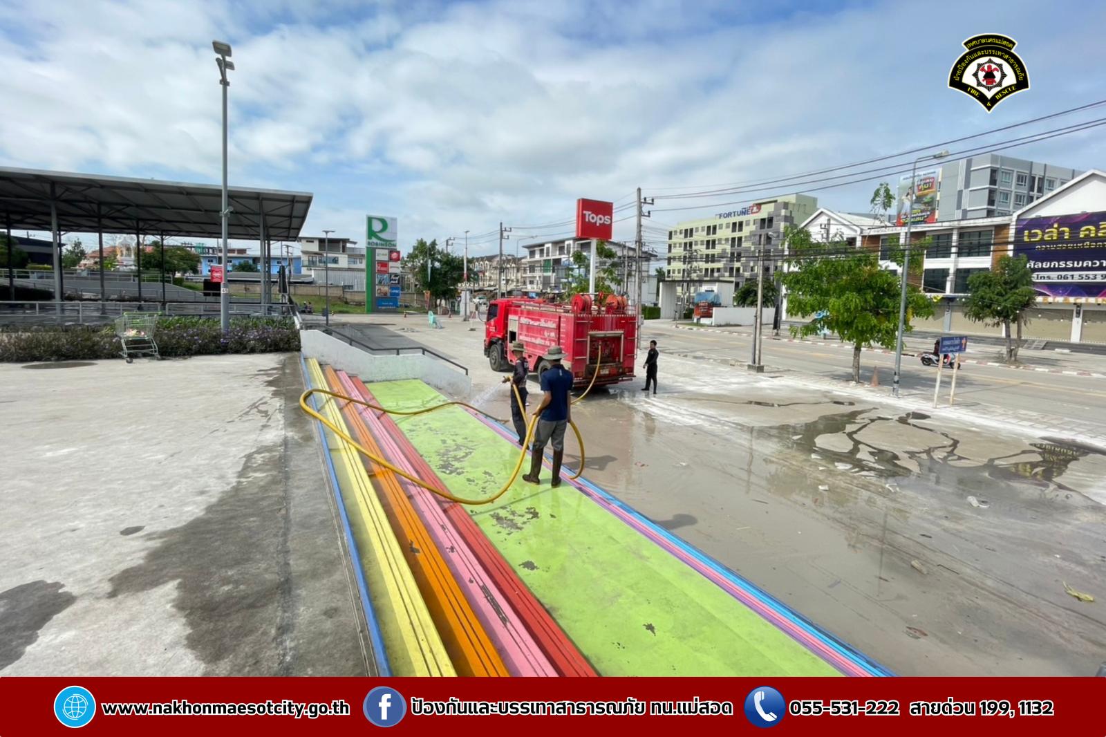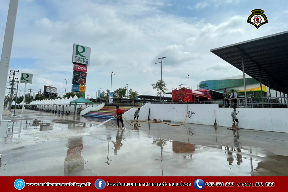 ฝ่ายป้องกันบรรเทาสาธารณภัย สำนักปลัดเทศบาล เทศบาลนครแม่สอด นำรถยนต์บรรทุกน้ำดับเพลิง จำนวน 2 คัน พร้อมชุดปฏิบัติการที่ 1 ออกดำเนินการร่วมพนักงาน โรบินสัน ไลฟ์สไตล์ แม่สอด จัดกิจกรรม Big Cleaning Day ทำความสะอาดลานจอดรถและลานสเก็ตบอร์ด เนื่องจากเมื่อวันที่ 13-15 เมษายน 2568 ได้จัดเป็นจุดให้เล่นน้ำสงกรานต์ (Zoning) เพื่อเป็นการรักษาความสะอาด