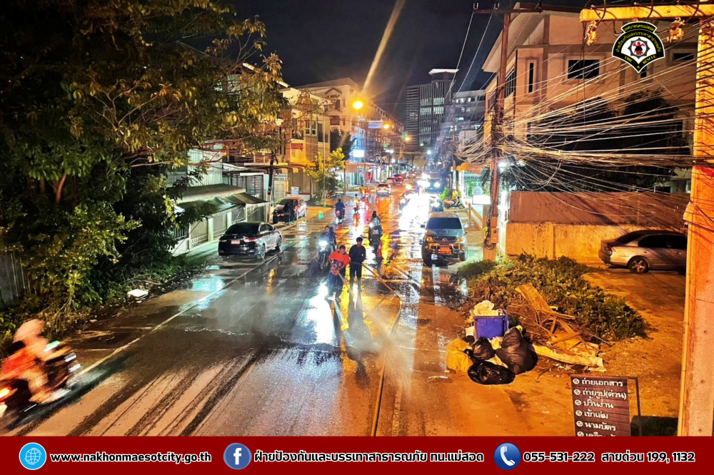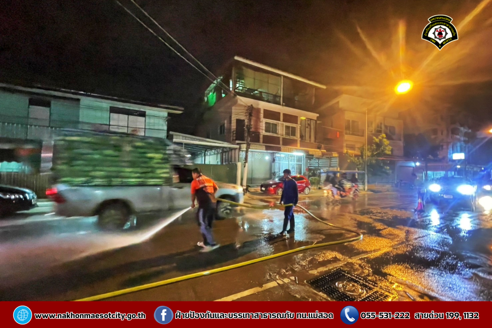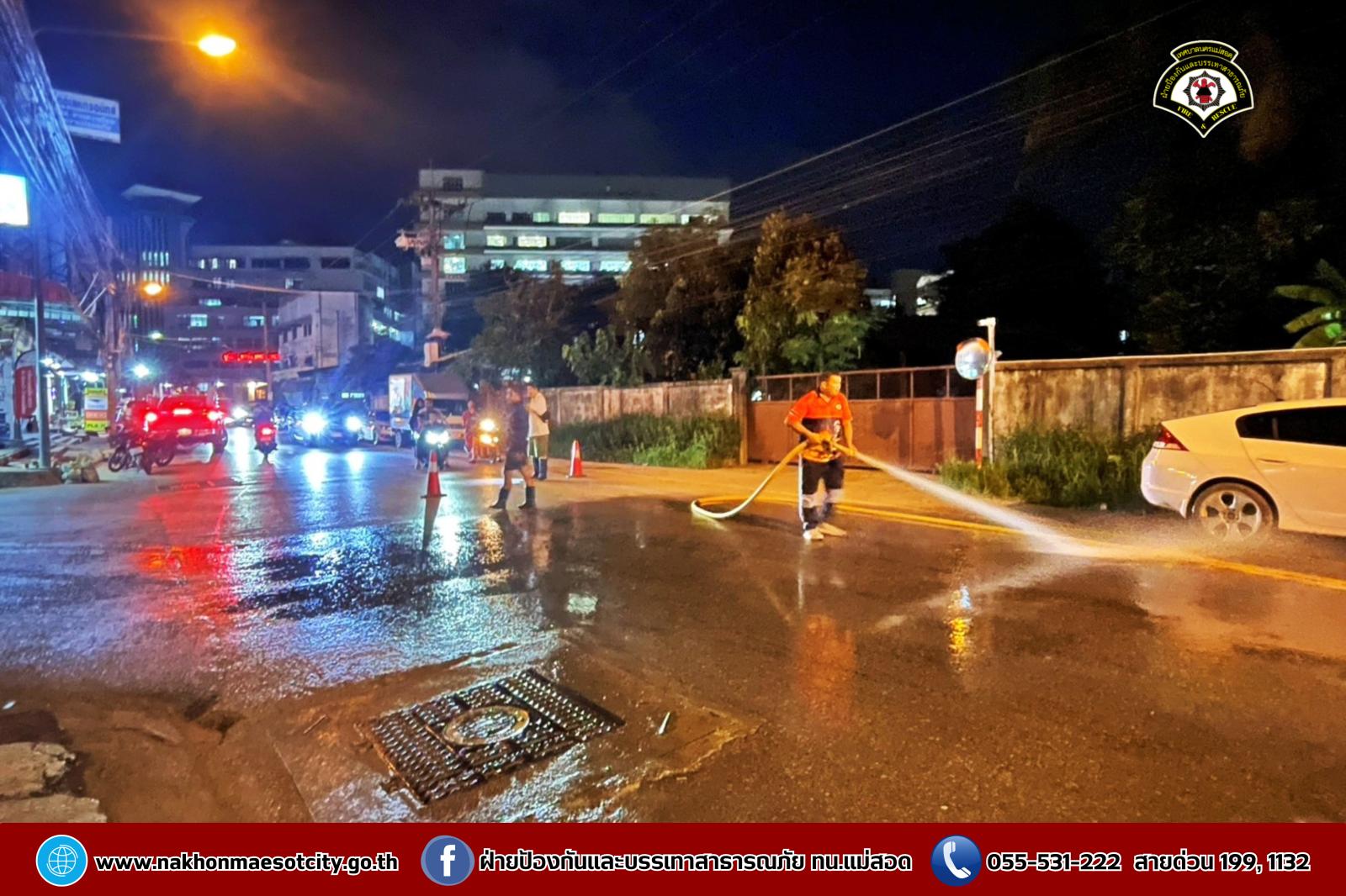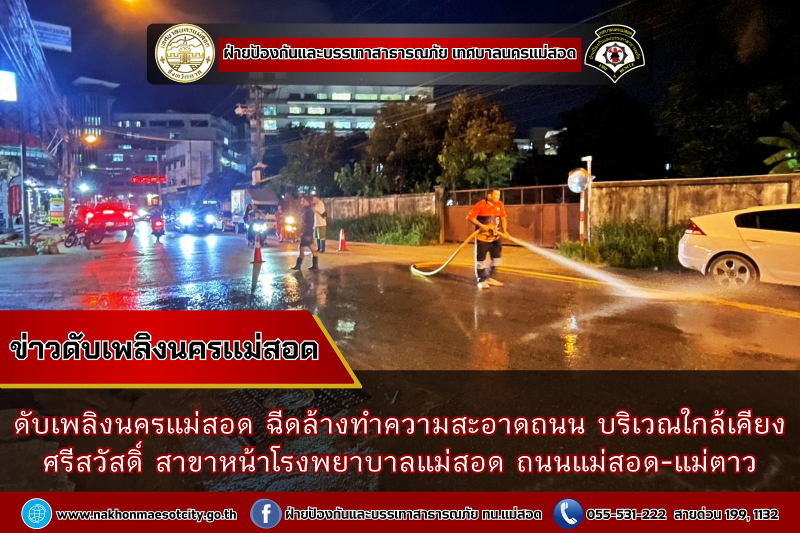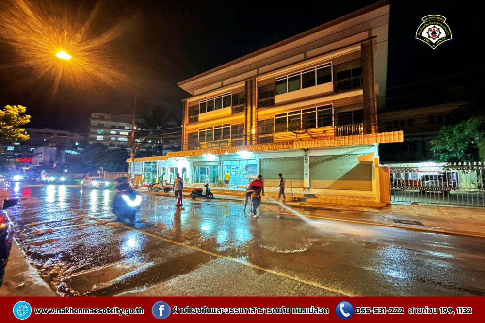 ฝ่ายป้องกันบรรเทาสาธารณภัย เทศบาลนครแม่สอด นำรถยนต์บรรทุกน้้ำดับเพลิง จำนวน 1 คัน พร้อมเจ้าหน้าที่ ออกดำเนินการฉีดล้างทำความสะอาดถนน บริเวณใกล้เคียงศรีสวัสดิ์ สาขาหน้าโรงพยาบาลแม่สอด ถนนแม่สอด-แม่ตาว อำเภอแม่สอด จังหวัดตาก เพื่อป้องกันการเกิดอุบัติเหตุถนนลื่น และเพื่อเป็นการรักษาความสะอาดพื้นผิวการจราจรต่อไป