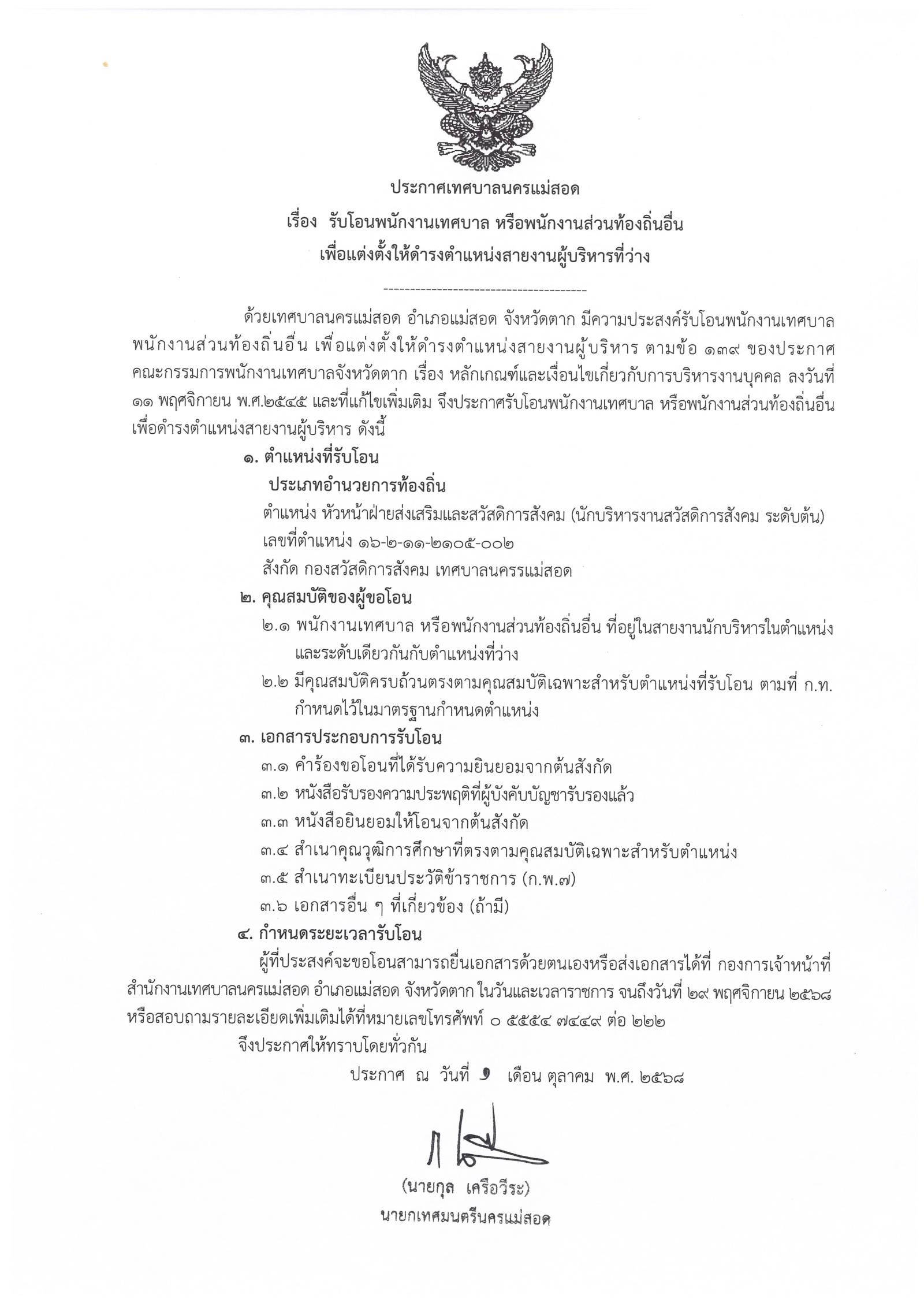 รับโอนพนักงานเทศบาล หรือ พนักงานส่วนท้องถิ่นอื่น มาดำรงตำแหน่งสายงานผู้บริหารประกาศ พนง สายงานผู้บริหาร.pdf