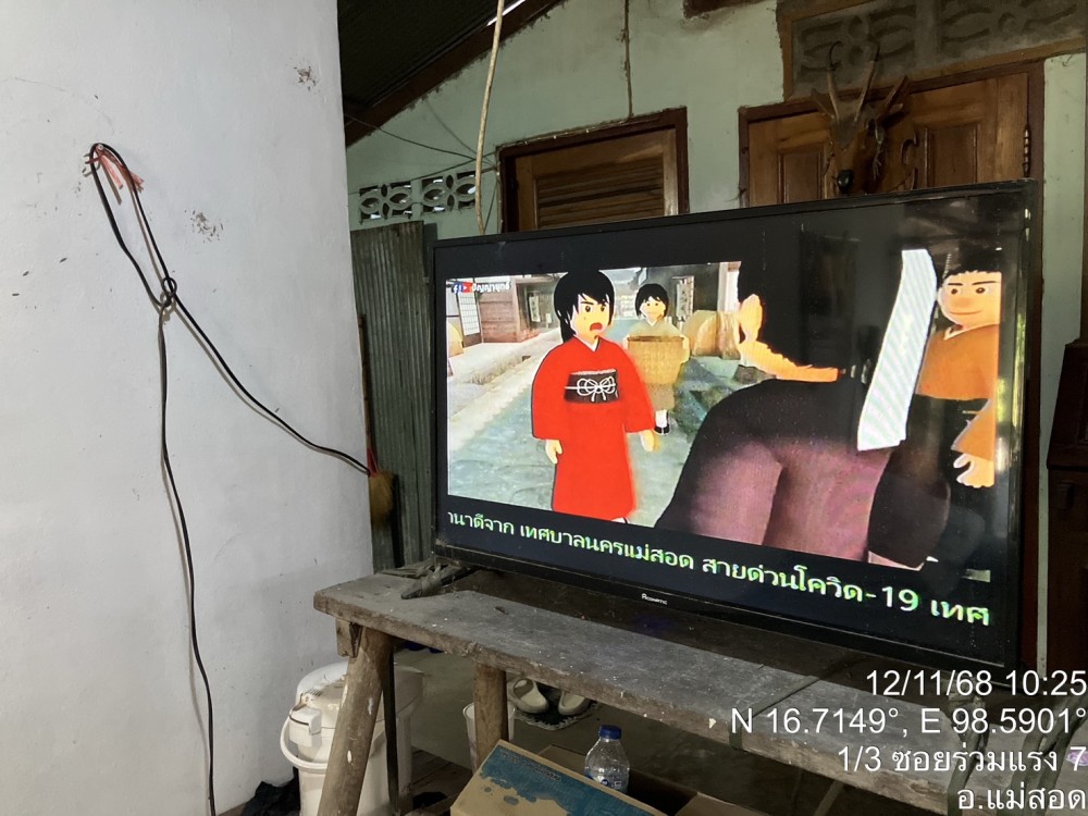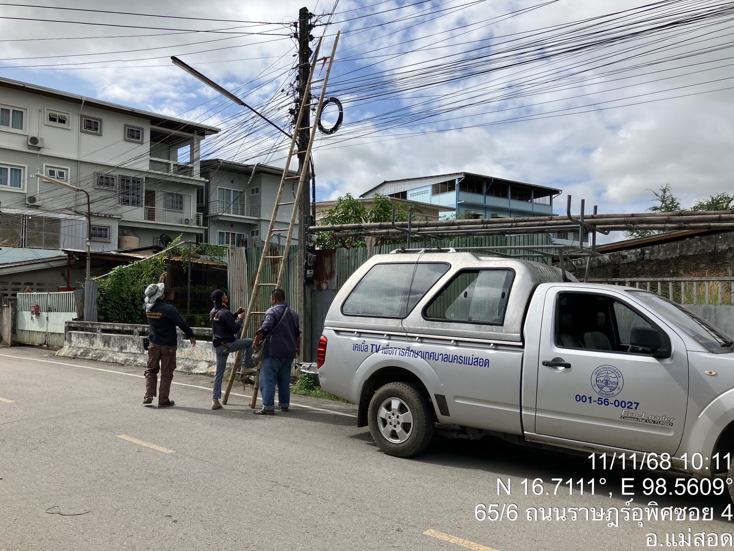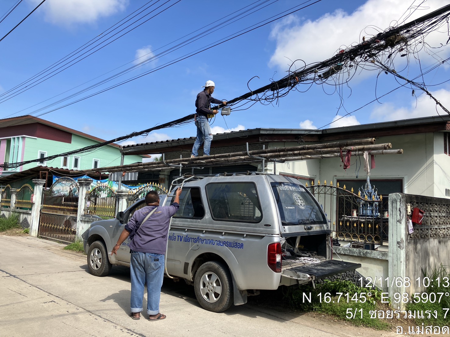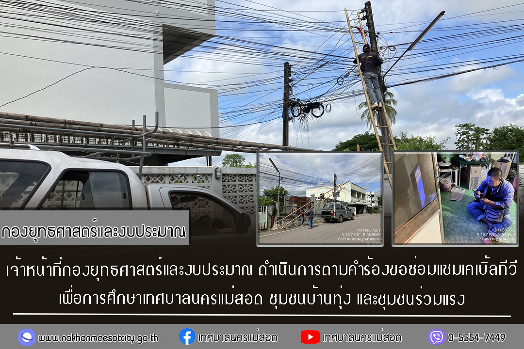ว่าที่พันตรี ดร.ไพฑูรย์ ปริญญาธรรมกุล ผู้อำนวยการกองยุทธศาสตร์และงบประมาณ มอบหมายให้เจ้าหน้าที่ช่างเคเบิ้ลทีวีเพื่อการศึกษา เจ้าหน้าที่ฝ่ายวิเทศสัมพันธ์ กองยุทธศาสตร์และงบประมาณ ลงพื้นที่ดำเนินการตามคำร้องขอซ่อมแซมเคเบิ้ลทีวีในเขตชุมชนบ้านทุ่งและชุมชนร่วมแรง เพื่อให้ประชาชนในชุมชนดังกล่าว สามารถกลับมารับชมบริการเคเบิ้ลทีวีเพื่อการศึกษาของเทศบาลนครแม่สอดได้ตามปกติ