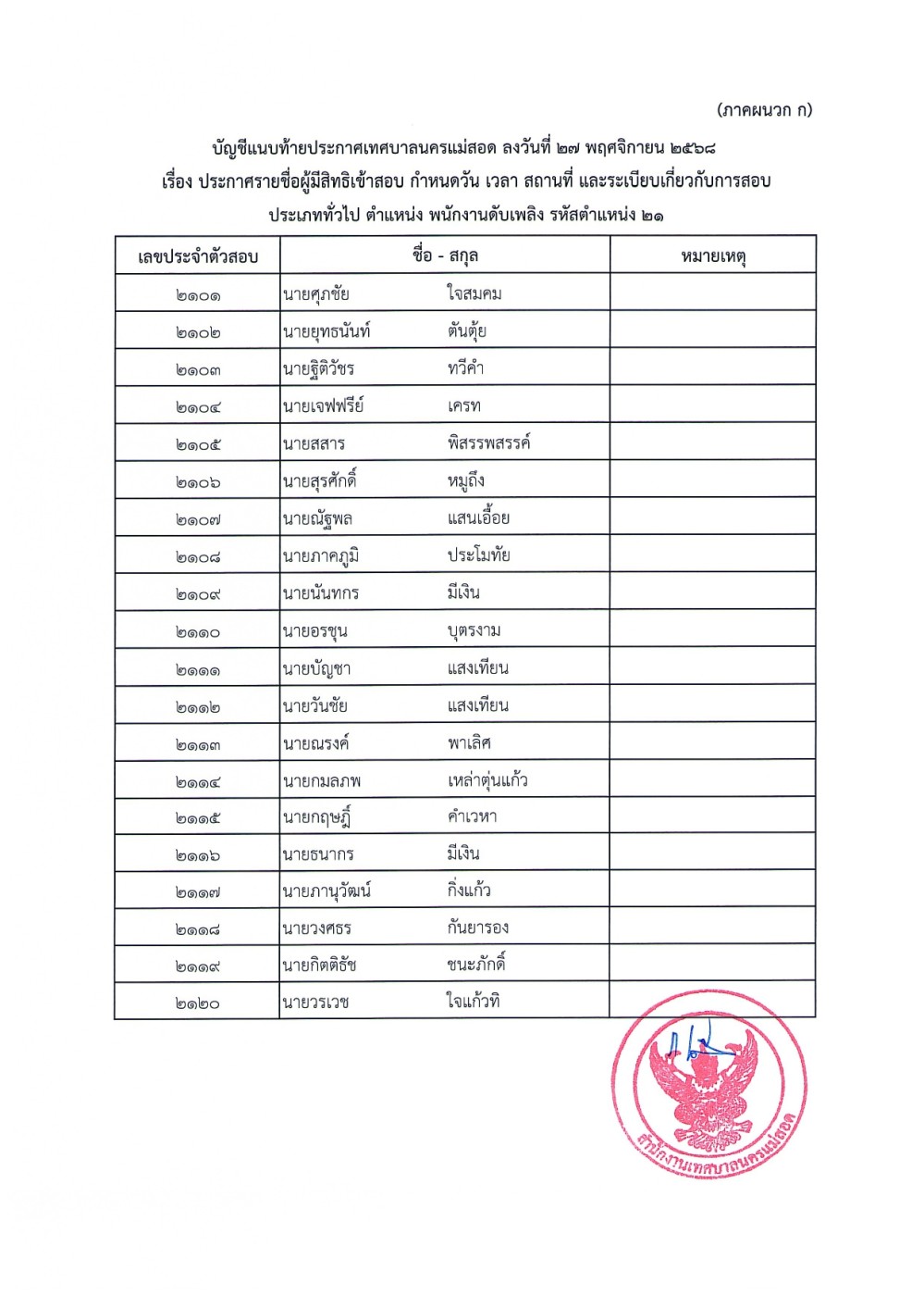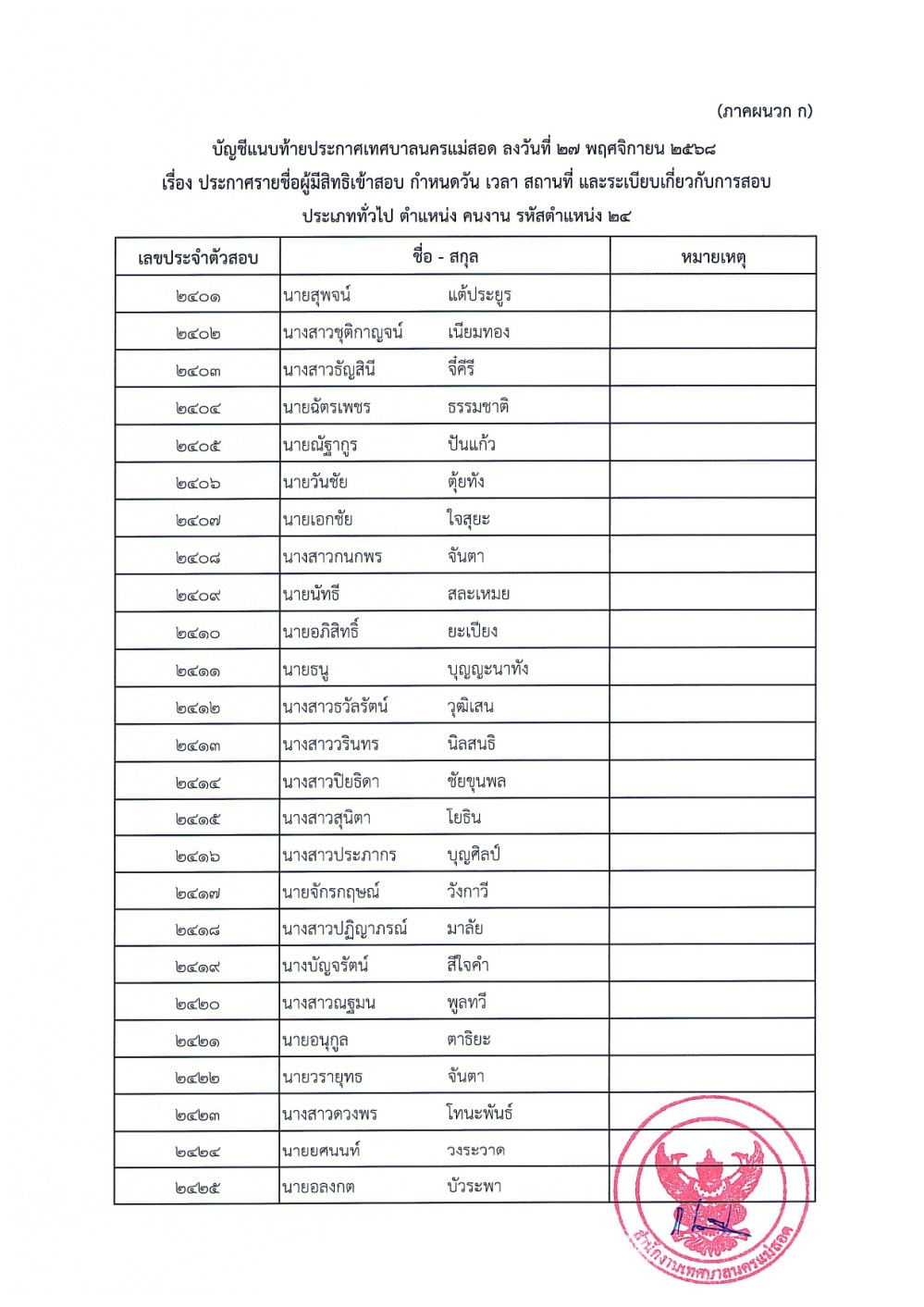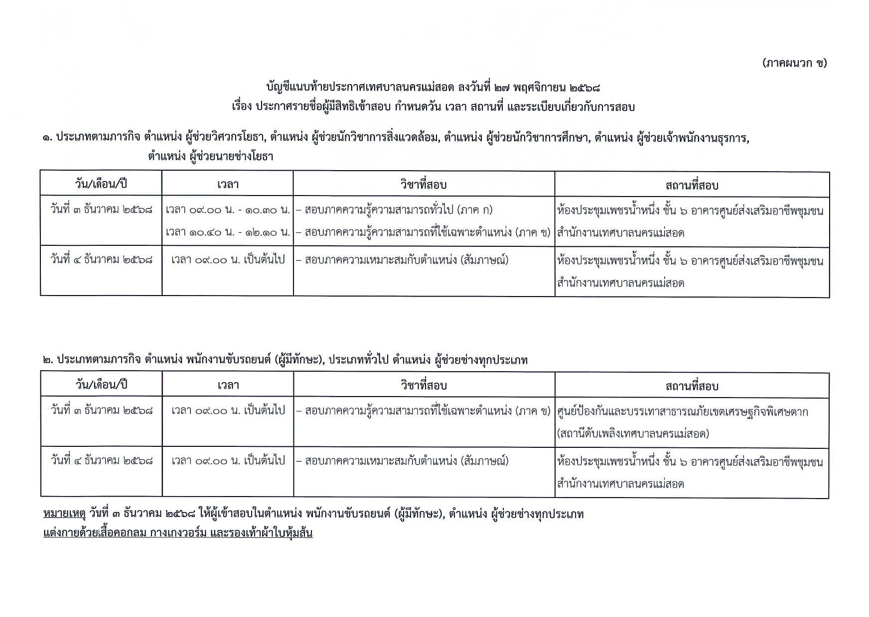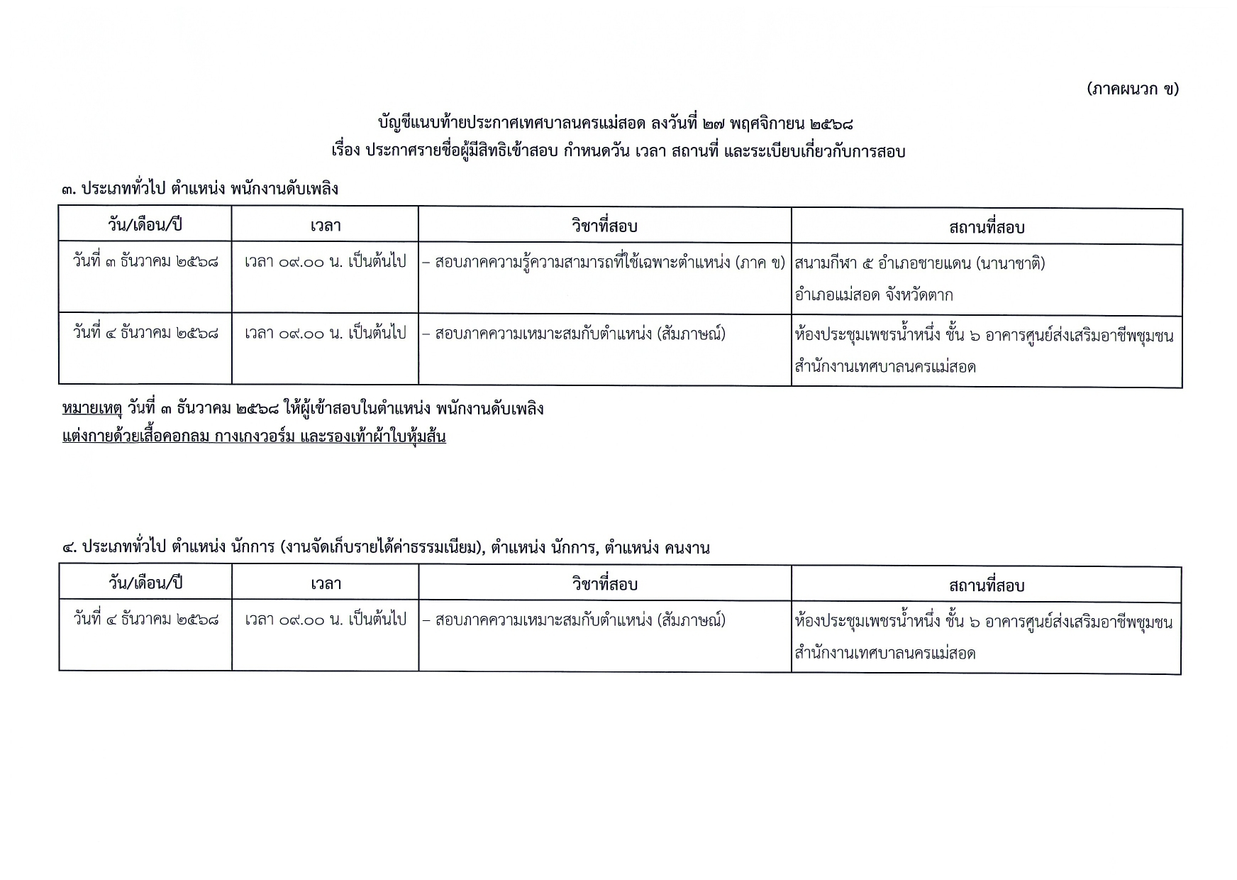 ประกาศเทศบาลนครแม่สอด เรื่อง ประกาศรายชื่อผู้มีสิทธิเข้าสอบ กำหนดวัน เวลา สถานที่ และระเบียบเกี่ยวกับการสอบ