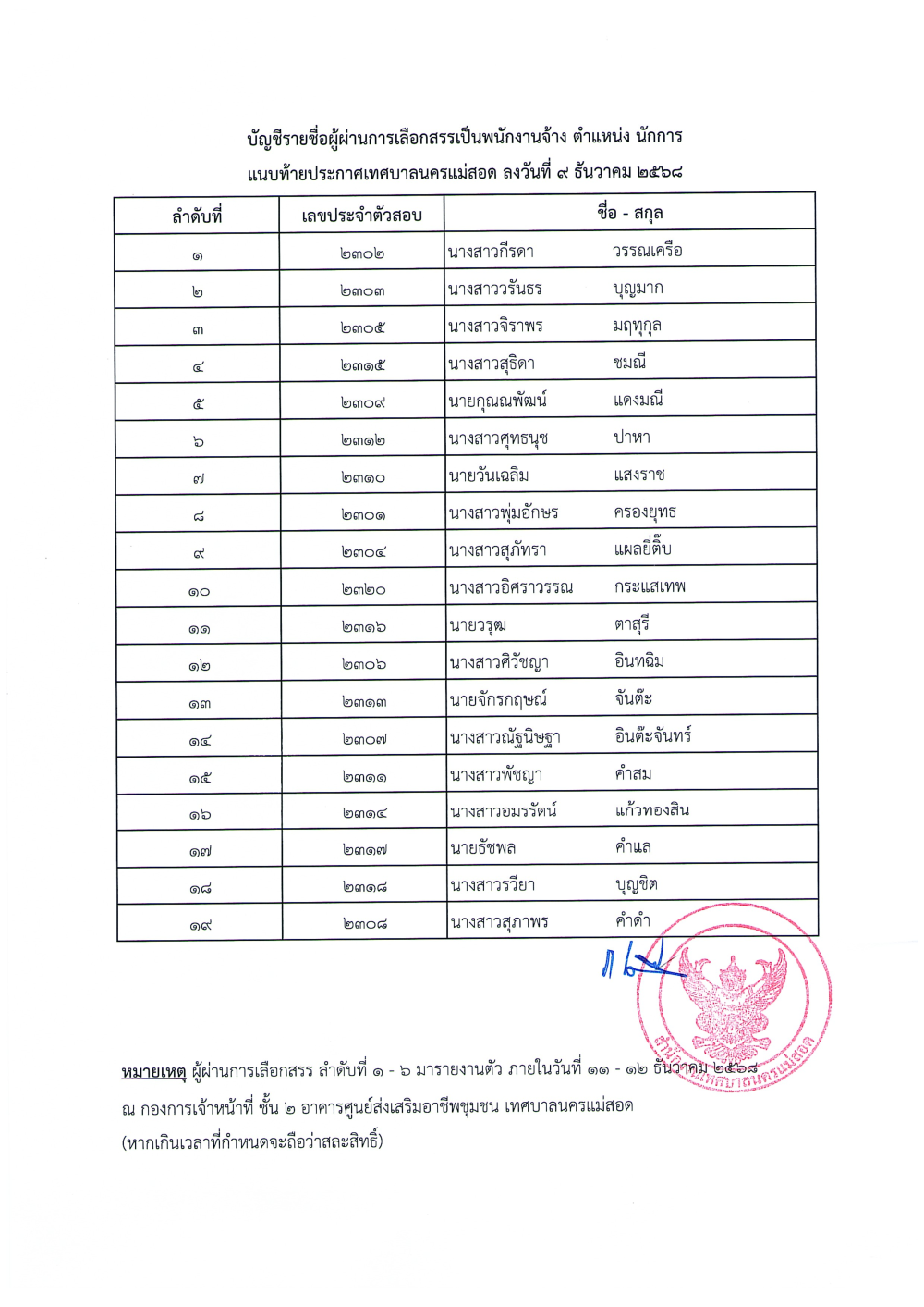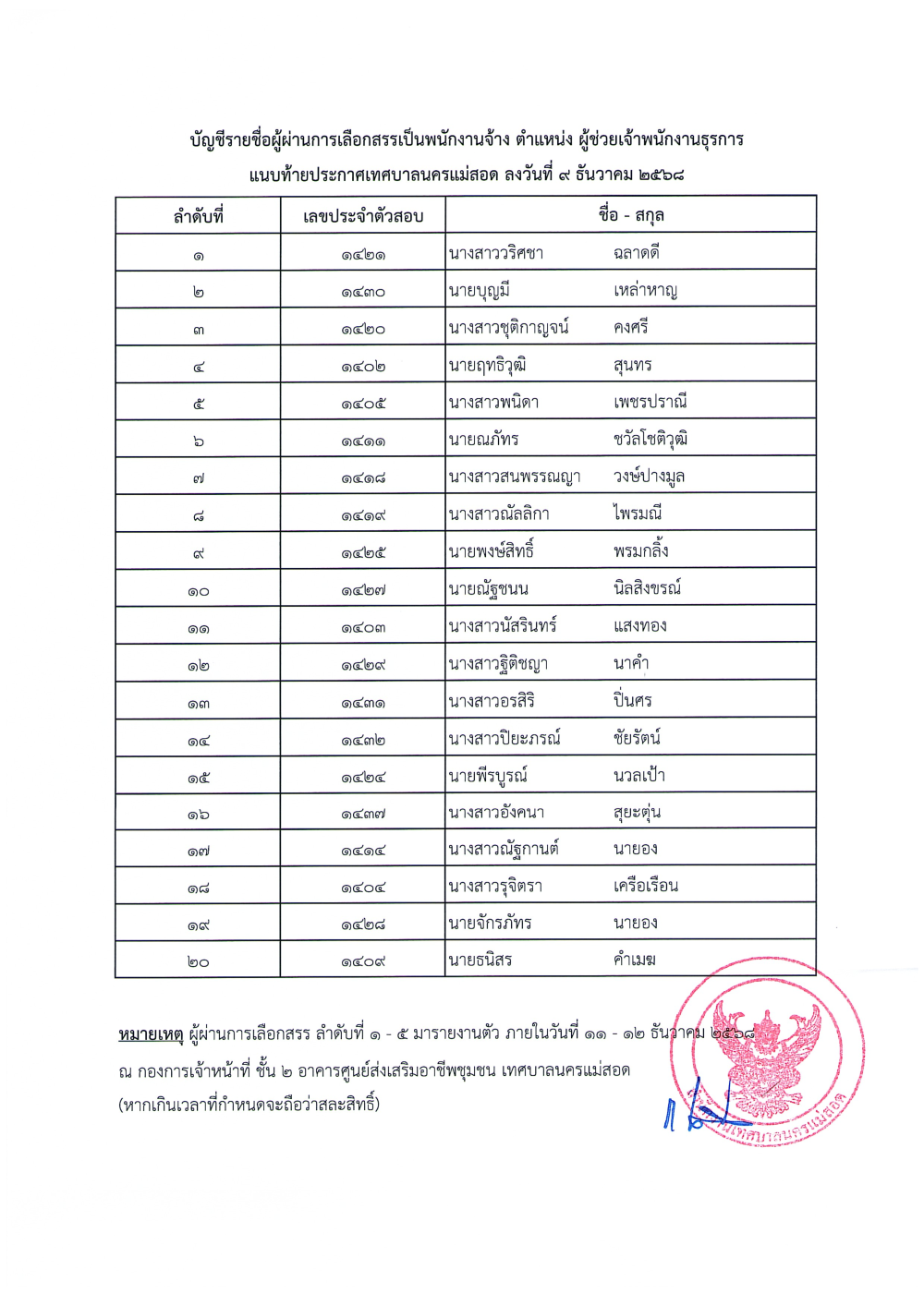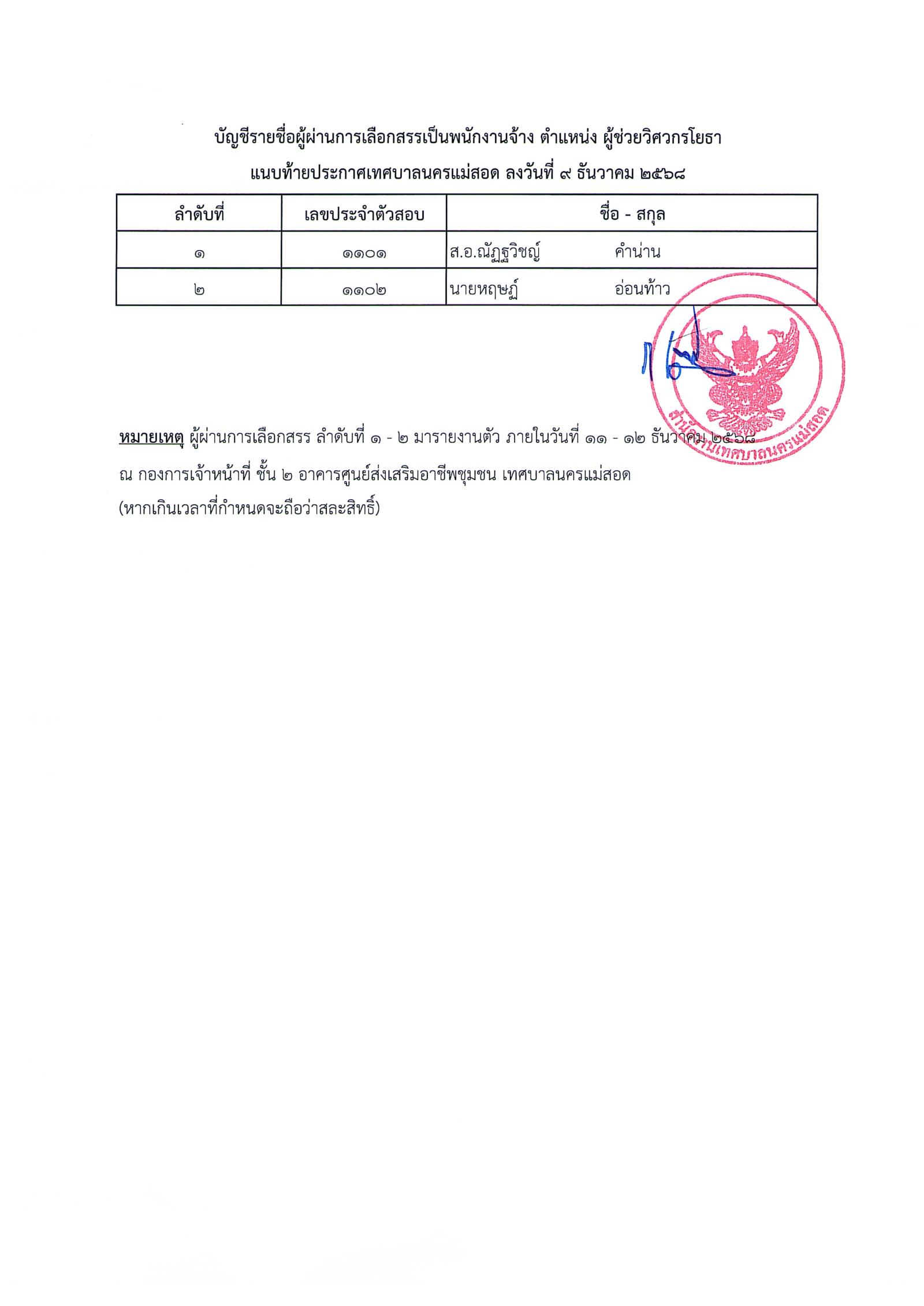 ประกาศเทศบาลนครแม่สอด เรื่อง ประกาศบัญชีรายชื่อและการขึ้นบัญชีผู้ผ่านการเลือกสรรเป็นพนักงานจ้าง