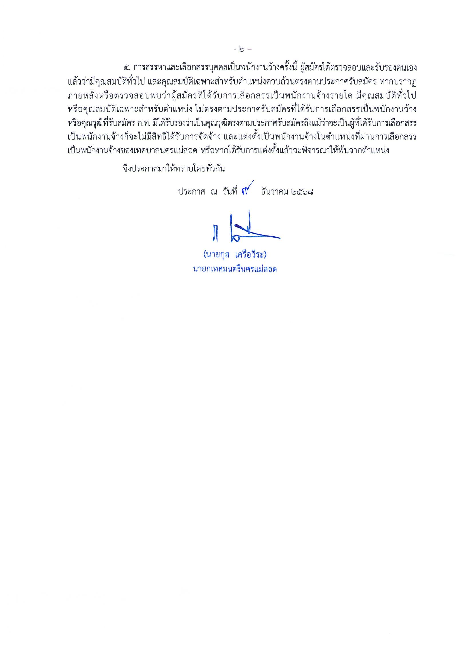 ประกาศเทศบาลนครแม่สอด เรื่อง รับสมัครบุคคลเพื่อสรรหาและเลือกสรรเป็นพนักงานจ้าง
