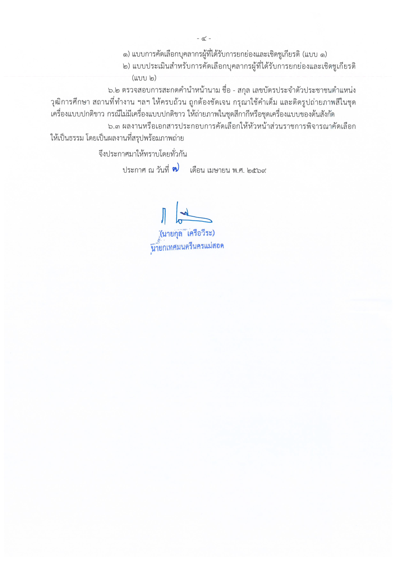 ประกาศเทศบาลนครแม่สอด เรื่อง หลักเกณฑ์และวิธีการคัดเลือกบุคลากรเพื่อยกย่องและเชิดชูเกียรติของเทศบาลนครแม่สอด ประจำปีงบประมาณ พ.ศ.2569