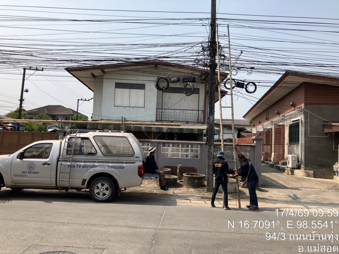 ว่าที่พันตรี ดร. ไพฑูรย์ ปริญญาธรรมกุล ผู้อำนวยการกองยุทธศาสตร์และงบประมาณ มอบหมายให้เจ้าหน้าที่ช่างเคเบิ้ลทีวีเพื่อการศึกษา เจ้าหน้าที่ฝ่ายวิเทศสัมพันธ์ กองยุทธศาสตร์และงบประมาณ ลงพื้นที่ดำเนินการซ่อมแซมเคเบิ้ลทีวีในเขตชุมชนดอนไชย เพื่อให้ประชาชนในชุมชนดังกล่าว สามารถกลับมารับชมบริการเคเบิ้ลทีวีเพื่อการศึกษาของเทศบาลแม่สอดได้ตามปกติ