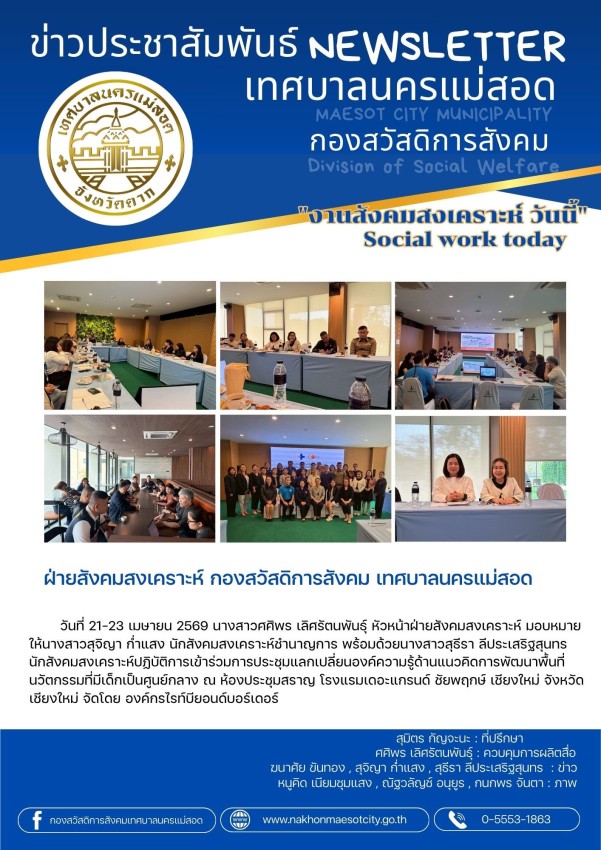 วันที่ 21-23 เมษายน 2569 นางสาวศศิพร เลิศรัตนพันธุ์ หัวหน้าฝ่ายสังคมสงเคราะห์ มอบหมายให้นางสาวสุจิญา ก่ำแสง นักสังคมสงเคราะห์ชำนาญการ พร้อมด้วยนางสาวสุธีรา ลีประเสริฐสุนทร นักสังคมสงเคราะห์ปฏิบัติการเข้าร่วมการประชุมแลกเปลี่ยนองค์ความรู้ด้านแนวคิดการพัฒนาพื้นที่นวัตกรรมที่มีเด็กเป็นศูนย์กลาง ณ ห้องประชุมสราญ โรงแรมเดอะแกรนด์ ชัยพฤกษ์ เชียงใหม่ จังหวัดเชียงใหม่ จัดโดย องค์กรไรท์บียอนด์บอร์เดอร์
