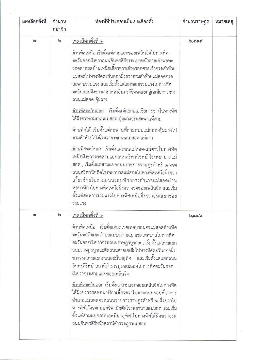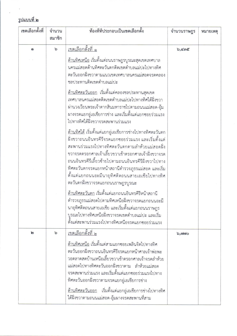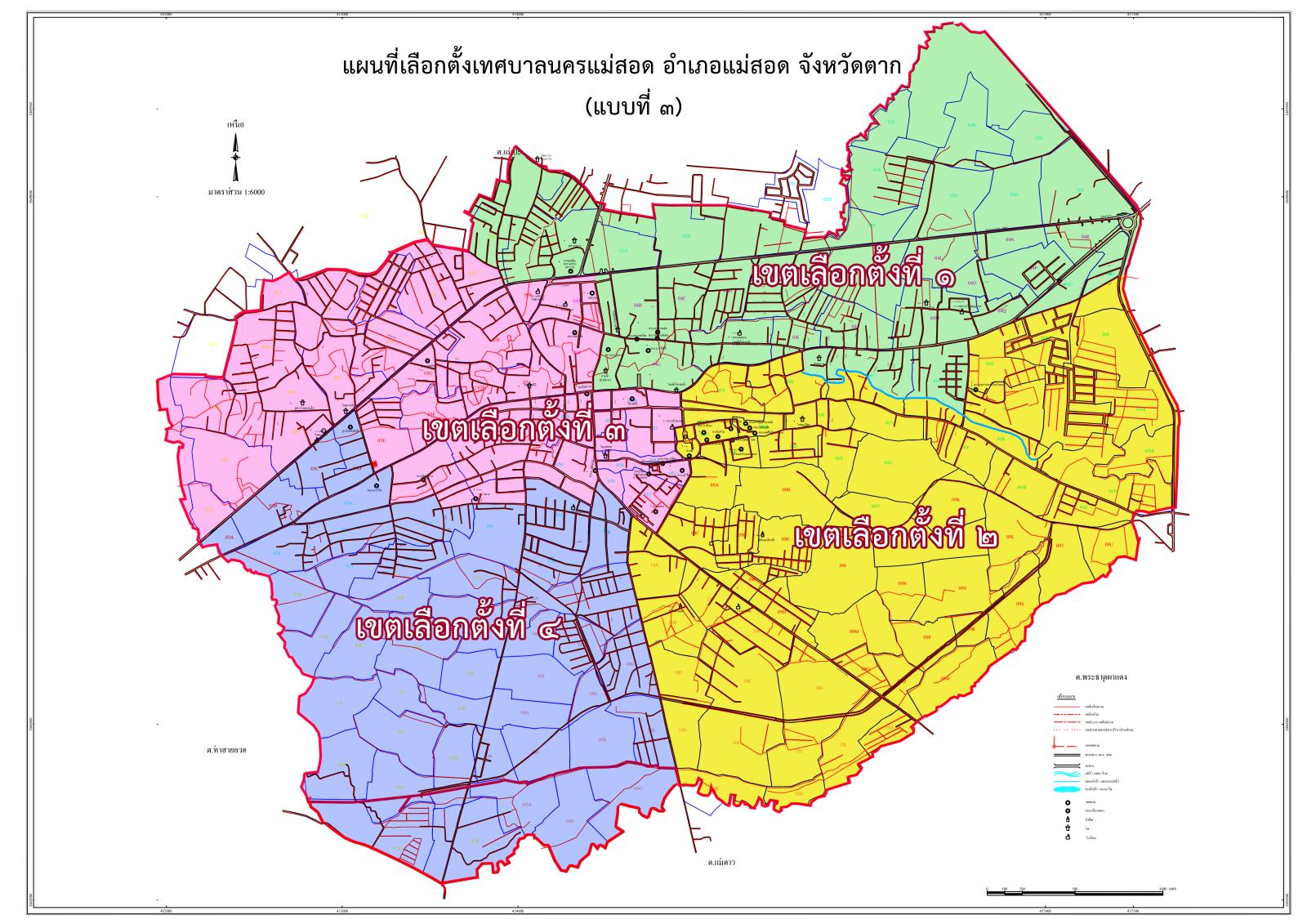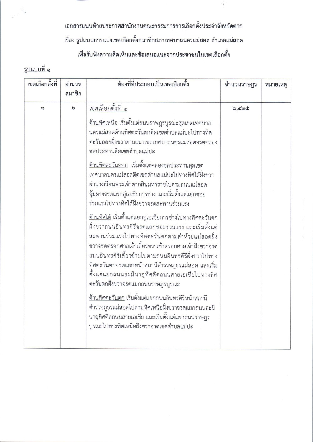 ประกาศสำนักงานคณะกรรมการการเลือกตั้งประจำจังหวัดตาก เรื่อง รูปแบบการเเบ่งเขตเลือกตั้งสมาชิกสภาเทศบาลนครแม่สอด อำเภอแม่สอด จังหวัดตาก เพื่อรับฟังความคิดเห็นและข้อเสนอเเนะจากประชาชนในเขตเลือกตั้ง