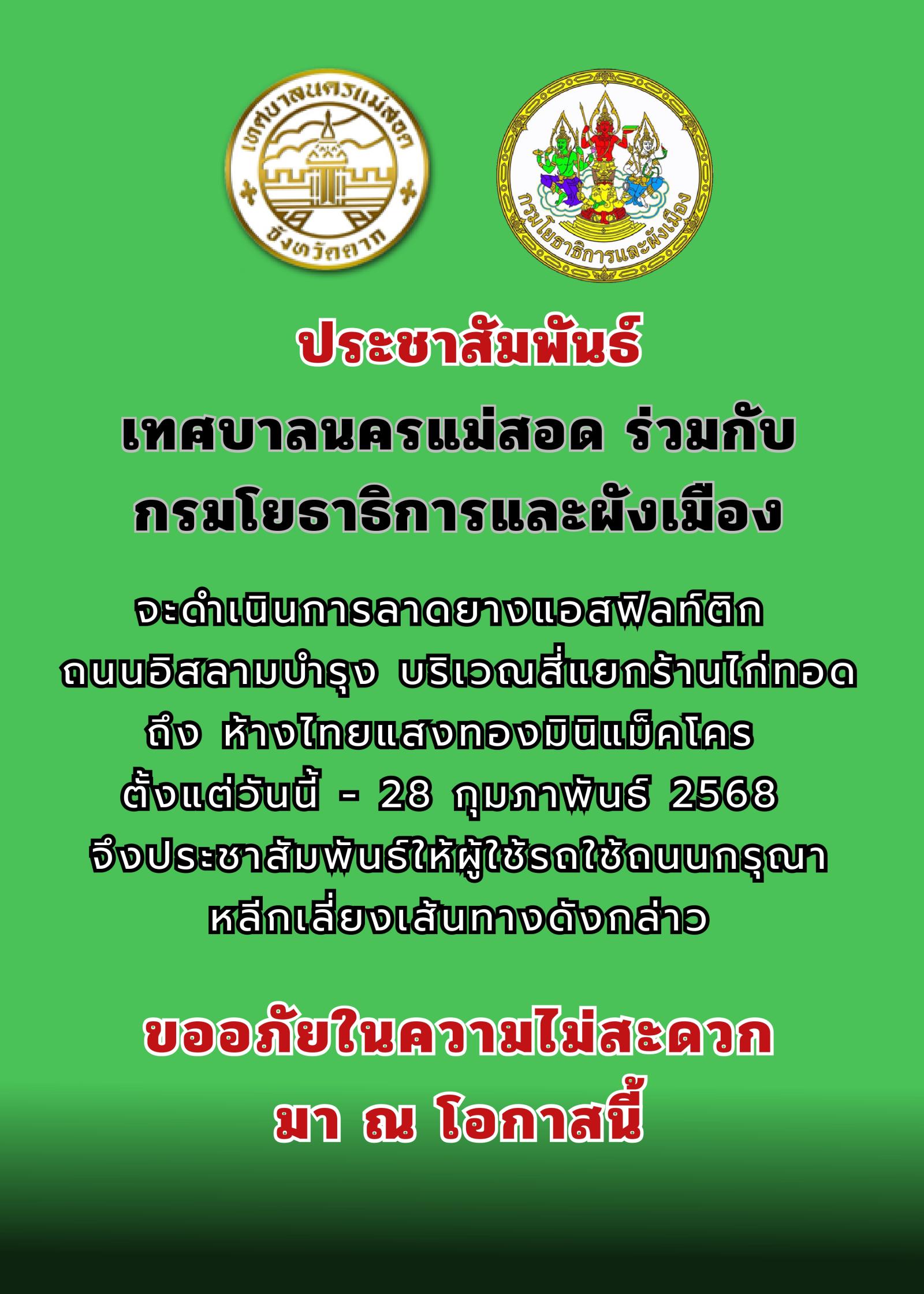 ประชาสัมพันธ์เทศบาลนครแม่สอดร่วมกับกรมโยธาธิการและผังเมืองจะดำเนินการลาดยางแอสฟิลท์ติก ถนนอิสลามบำรุงบริเวณสี่แยกร้านไก่ทอดถึงห้างไทยแสงทองมินิแม็คโคร ตั้งแต่วันนี้ - 28 กุมภาพันธ์ 2568 จึงประชาสัมพันธ์ให้ผู้ใช้รถใช้ถนนกรุณาหลีกเลี่ยงเส้นทางดังกล่าวขออภัยในความไม่สะดวกมา ณ โอกาสนี้